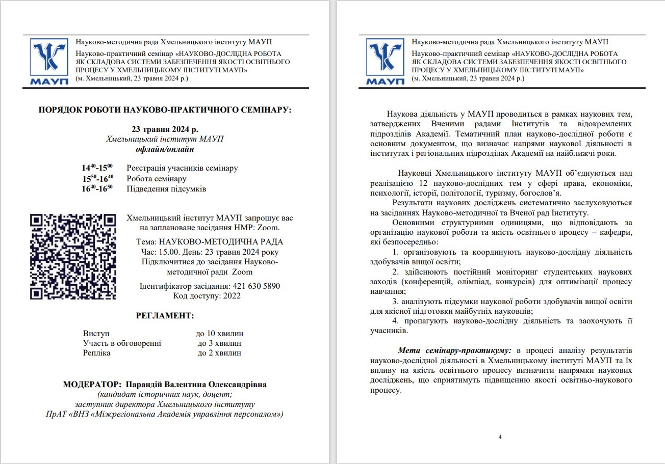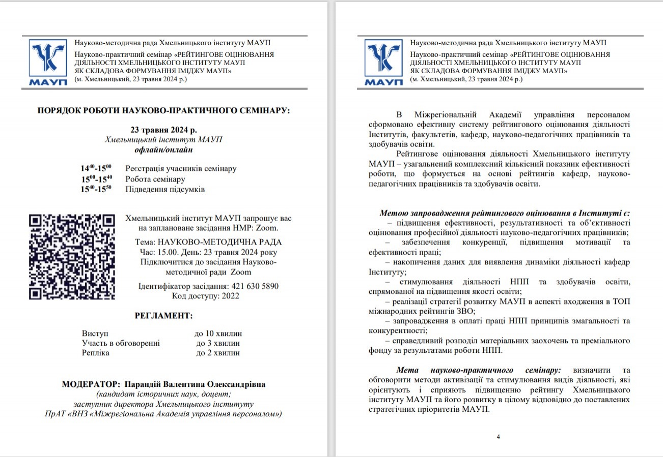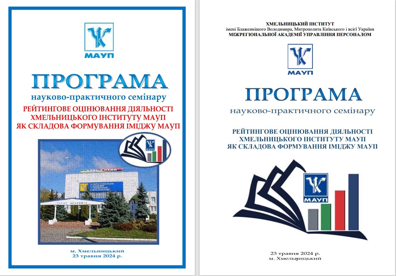 23 травня у рамках засіданНЯ Науково-методичної ради Хмельницького інституту МАУП відбулися науково-практичні семінари: «РЕЙТИНГОВЕ ОЦІНЮВАННЯ ДІЯЛЬНОСТІ ХМЕЛЬНИЦЬКОГО ІНСТИТУТУ МАУП ЯК СКЛАДОВА ФОРМУВАННЯ ІМІДЖУ МАУП» та «Науково-дослідна робота як складова системи забезпечення якості освітнього процесу у Хмельницькому інституті МАУП».