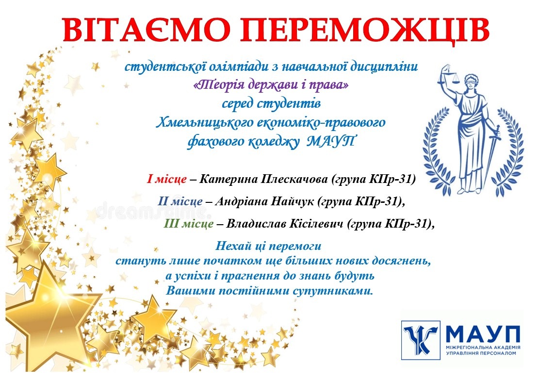 Переможці студентської олімпіади з навчальної дисципліни «Теорія держави і права» серед студентів Хмельницького економіко-правового фахового коледжу МАУП: