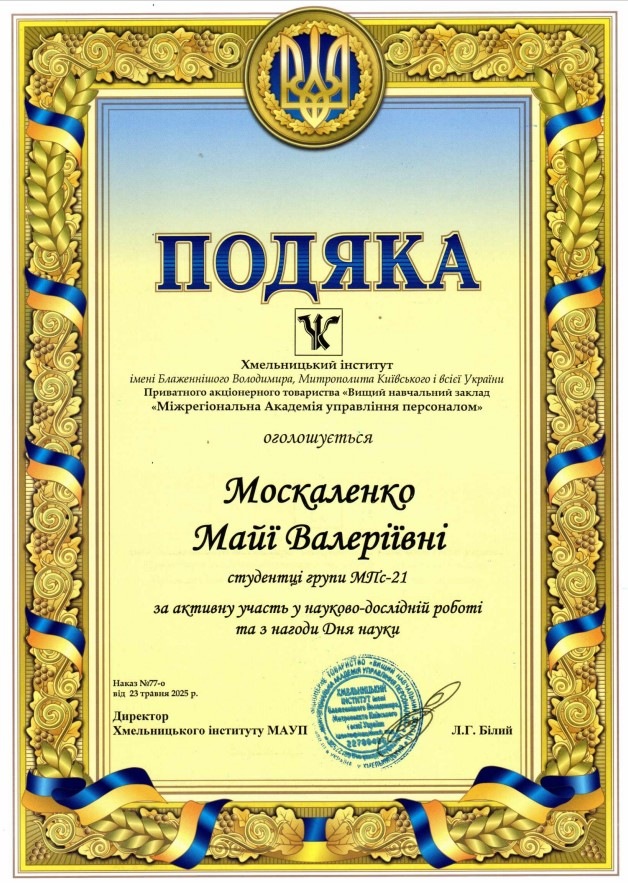 Москаленко Майї Валеріївні, студентці гр. МПс-21