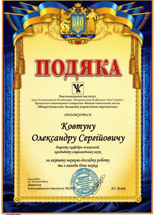 Ковтуну Олександру Сергійовичу, доценту кафедри психології, кандидату соціологічних наук, доценту.