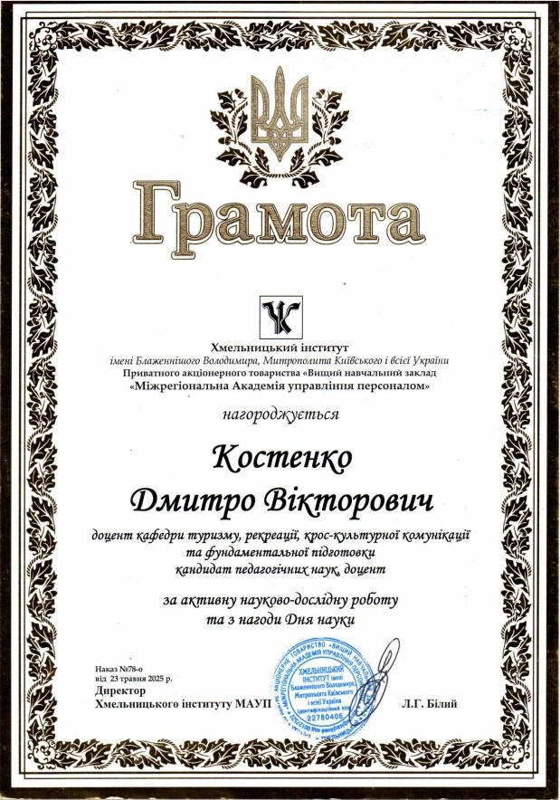 Костенка Дмитра Вікторовича, доцента кафедри туризму, рекреації, крос-культурної комунікації та фундаментальної підготовки, кандидата педагогічних наук, доцента.