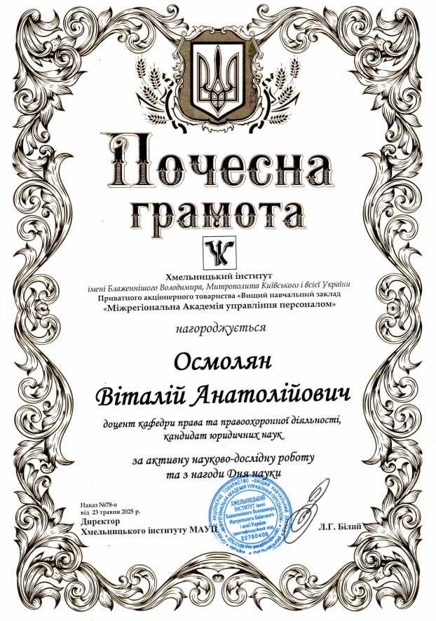 Осмоляна Віталія Анатолійовича, доцента кафедри права та правоохоронної діяльності, кандидата юридичних наук.