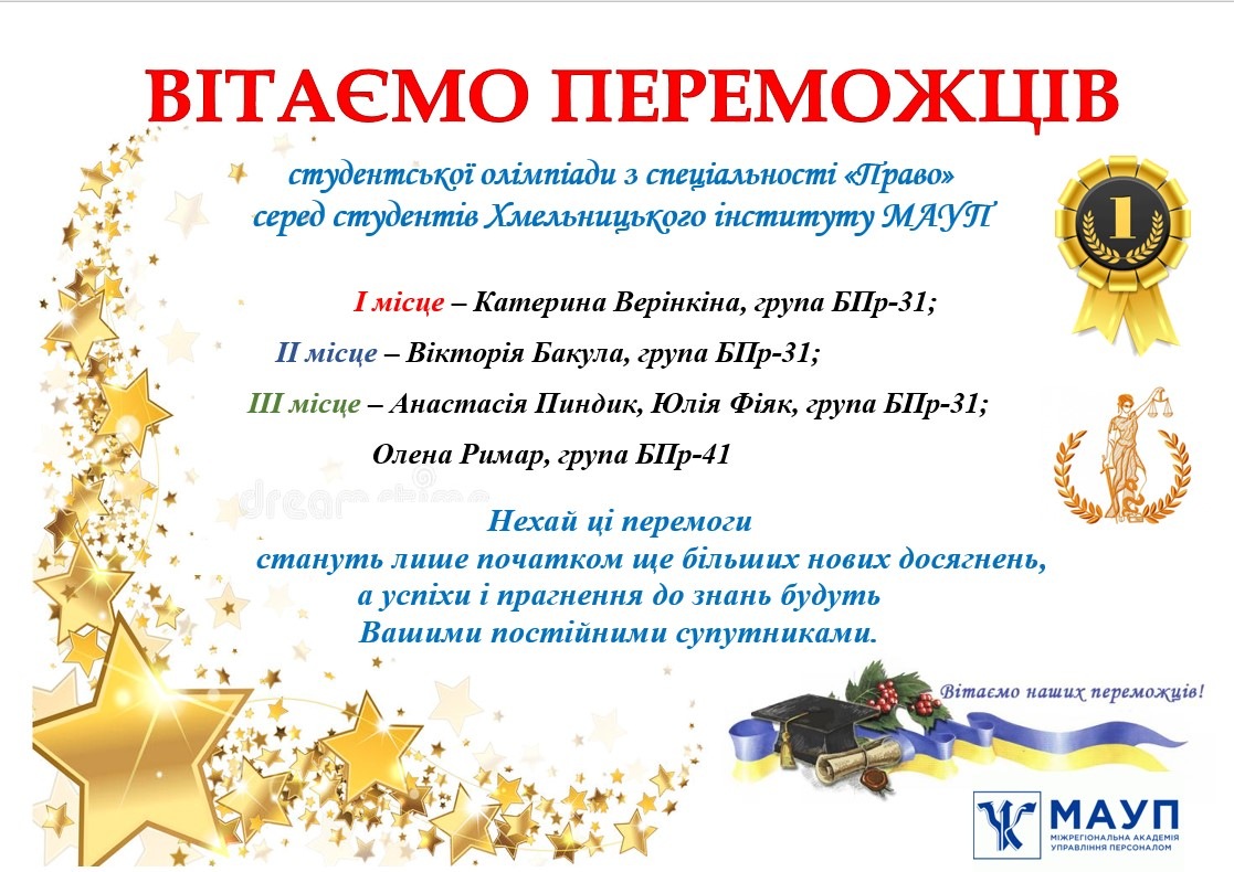 22 лютого 2023 року у Хмельницькому інституті МАУП кафедрою права та правоохоронної діяльності проведено І етап Всеукраїнської студентської олімпіади зі спеціальності «Право».