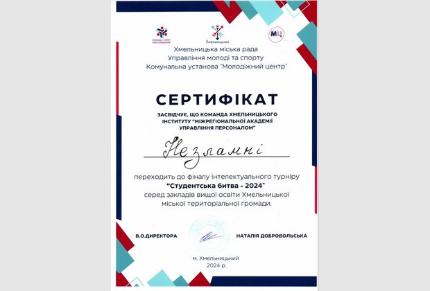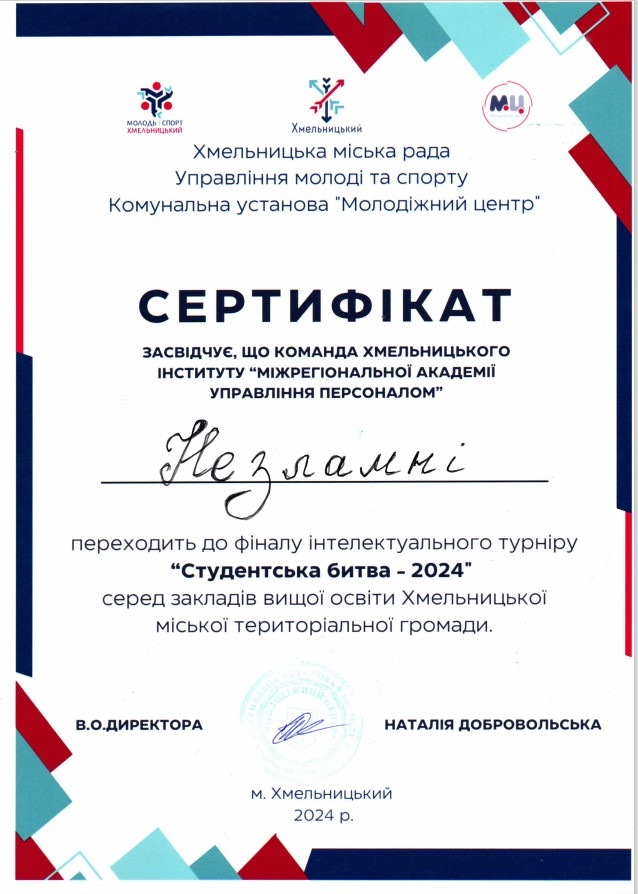 За результатами інтелектуального турніру до фіналу пройшла команда «Незламні», з якою ми зустрінемося на фіналі «Студентської битви 2024» серед закладів вищої освіти Хмельницької міської територіальної громади.
