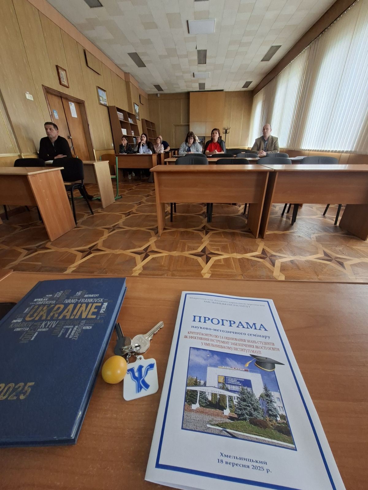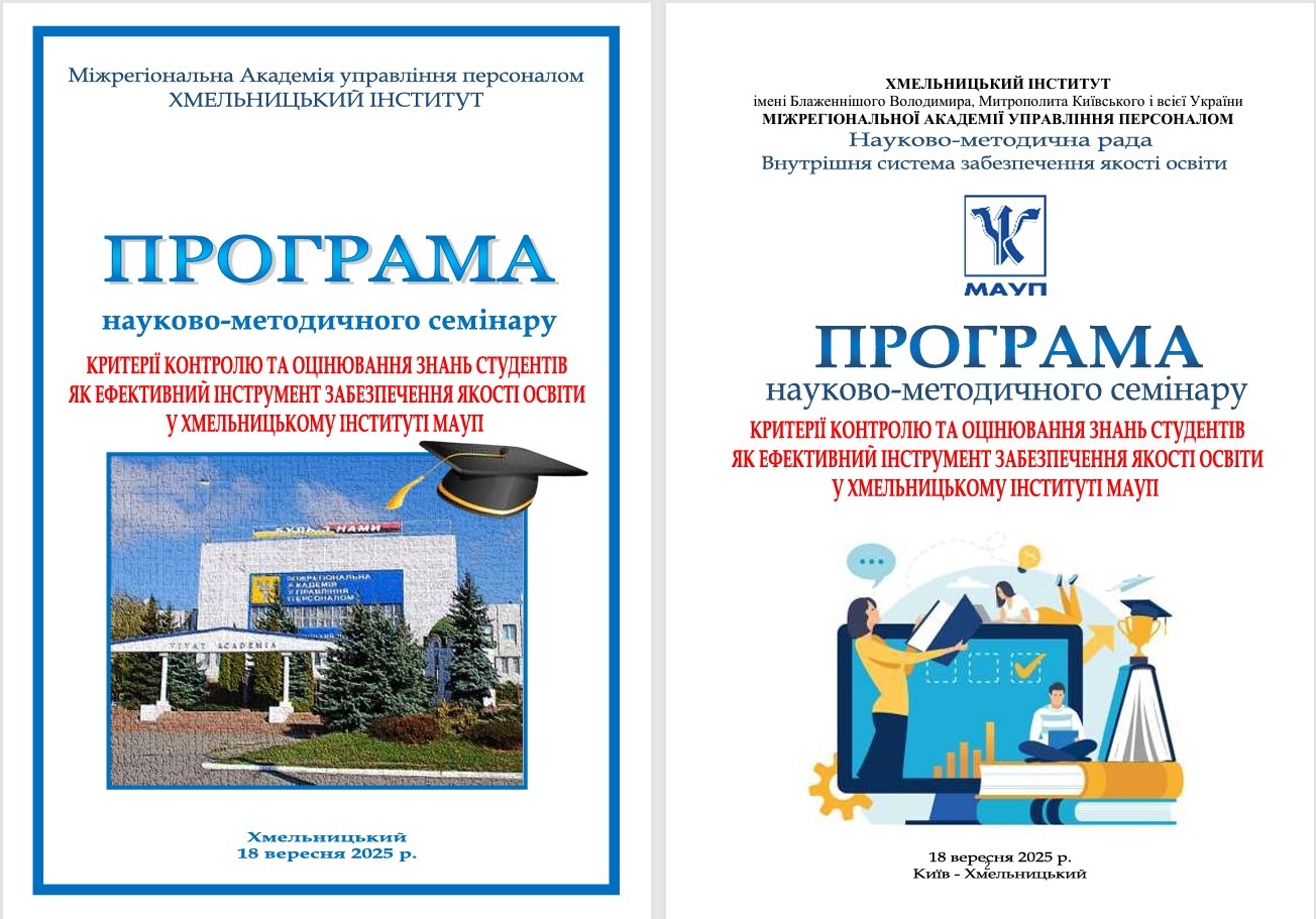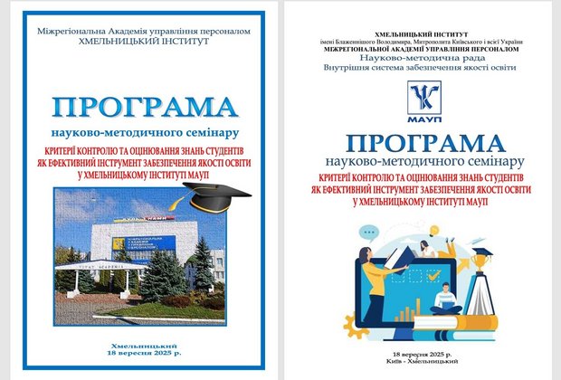 18 вересня 2025 року у рамках засідання Науково-методичної ради відбувся Науково-методичний семінар «КРИТЕРІЇ КОНТРОЛЮ ТА ОЦІНЮВАННЯ ЗНАНЬ СТУДЕНТІВ ЯК ЕФЕКТИВНИЙ ІНСТРУМЕНТ ЗАБЕЗПЕЧЕННЯ ЯКОСТІ ОСВІТИ У ХМЕЛЬНИЦЬКОМУ ІНСТИТУТІ МАУП». Модератор: Парандій Валентина Олександрівна (директор Хмельницького інституту МАУП, кандидат історичних наук, доцент). Спікер: Авсієвич Алла Валеріївна (декан гуманітарно-економічного факультету Хмельницького інституту МАУП, PhD).