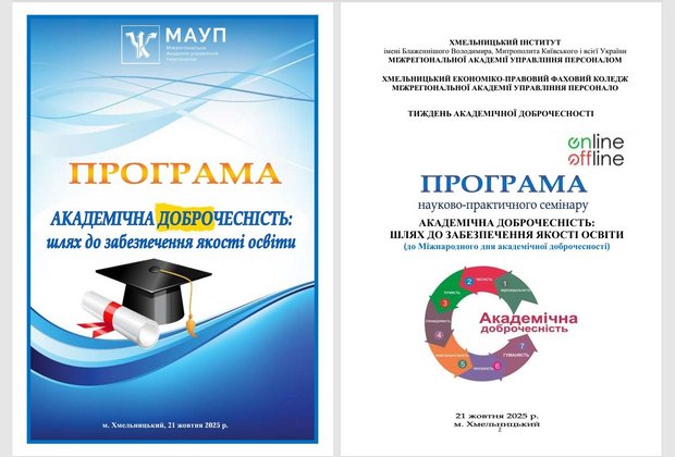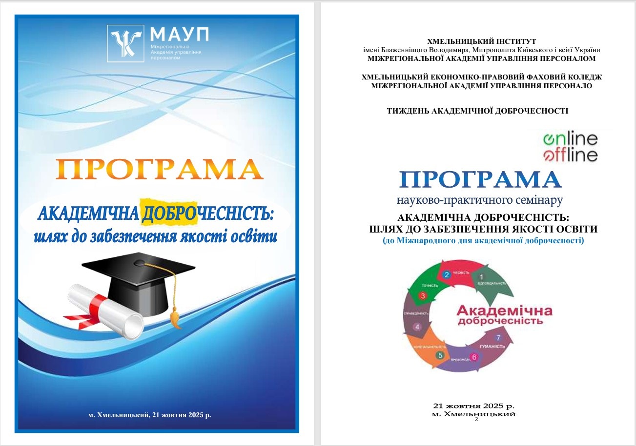 21 жовтня 2025 року до Міжнародного дня академічної доброчесності у рамках Тижня академічної доброчесності у Хмельницькому інституті та коледжі МАУП відбувся науково-практичний семінар «Академічна доброчесність: шлях до забезпечення якості освіти».