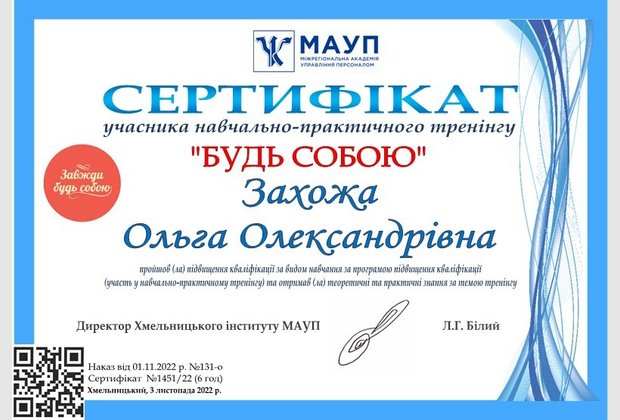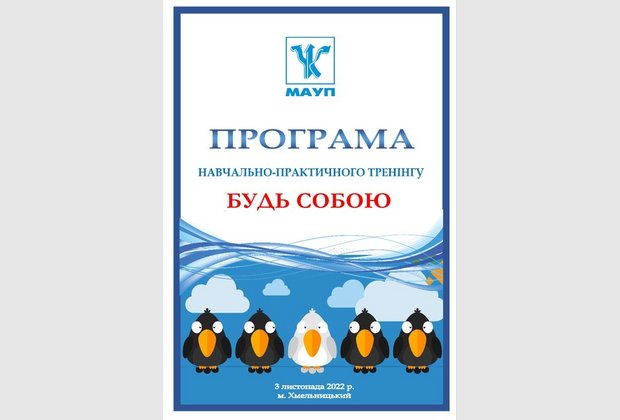 3 листопада 2022 року викладач кафедри психології Хмельницького інституту МАУП, провідний психолог Хмельницького міського центру соціальних служб, практикуючий психолог Захожа Ольга Олександрівна провела для студентів 3-4 курсів навчально-практичний тренінг «Будь собою».