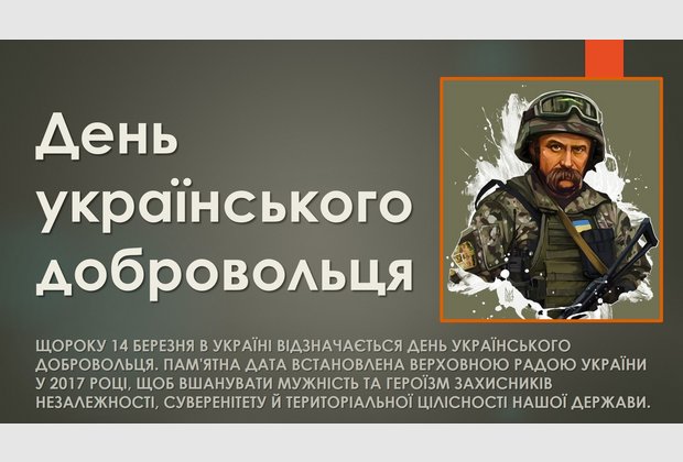 Щороку 14 березня в Україні відзначається День українського добровольця. Дата 14 березня була обрана не випадково. Саме в цей день у 2014 році на тренувальну базу в Нових Петрівцях з Майдану Незалежності вирушили перші 500 бійців-добровольців Самооборони Майдану для формування першого добровольчого батальйону. Чоловіки й жінки самоорганізувалися та вирушили на схід України – на захист нашої держави та її суверенітету.