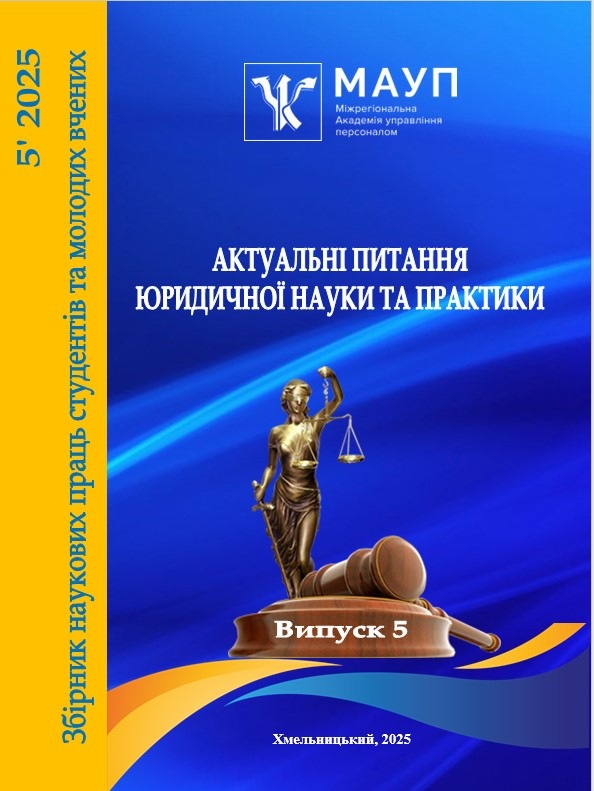 Актуальні питання юридичної науки та практики: зб. наук. пр. студ. та молодих вчених / гол. ред. Л. Г. Білий. Хмельницький : Вид-во МАУП, 2025. Вип. 5. 270 с. Державний реєстраційний номер: 0123U104485 https://drive.google.com/file/d/16BVtS68-Rkv7rES_qnUhuqEvepX070yb/view