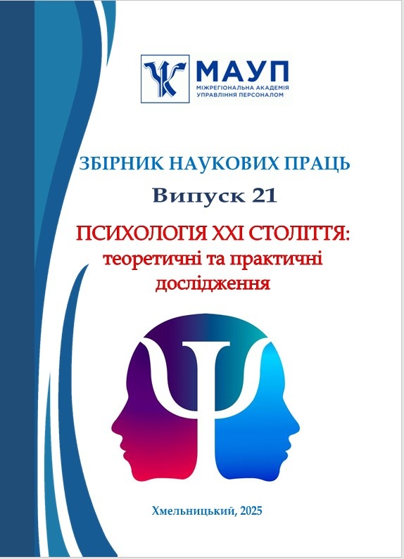Психологія ХХІ століття: теоретичні та практичні дослідження: зб. наук. пр. / гол. ред. Л.Г. Білий. Хмельницький: Вид-во МАУП, 2025. Вип. 21. С.300. Державний реєстраційний номер: 0123U104488 https://drive.google.com/file/d/1Ozx3pWKSll0gq3FMA6EuWxJ9Og_xBTpg/view
