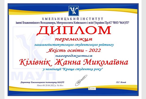 Кращою студенткою 2022 року стала Кілівнік Жанна, студентка спеціальності «Право» першого (бакалаврського) рівня вищої освіти, голова наукового товариства студентів та молодих вчених Інституту набравши 517,4 рейтингових бали.