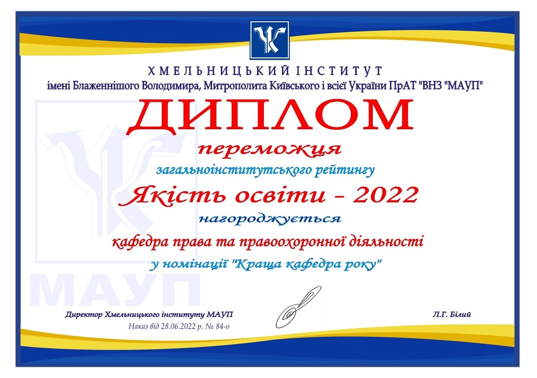 Диплом переможця у номінації «Краща кафедра року» отримала кафедра права та правоохоронної діяльності набравши 19009,6 рейтинговий балів.
