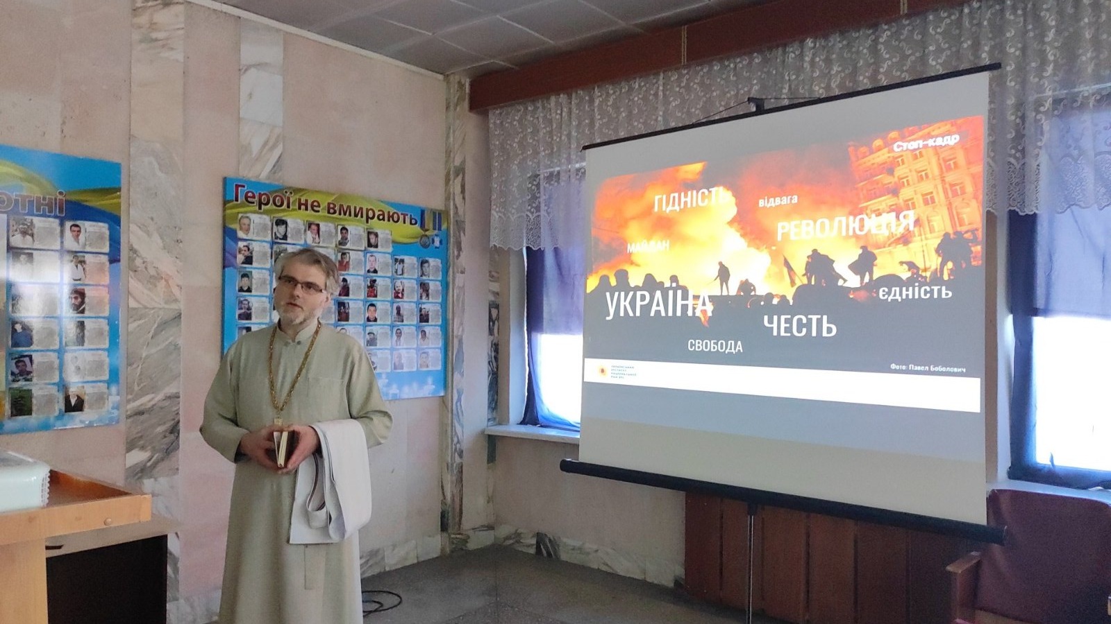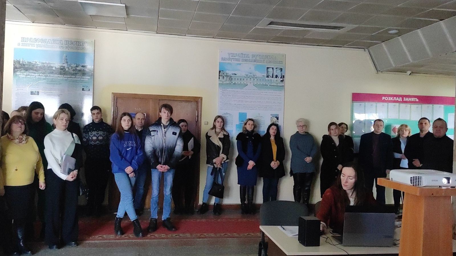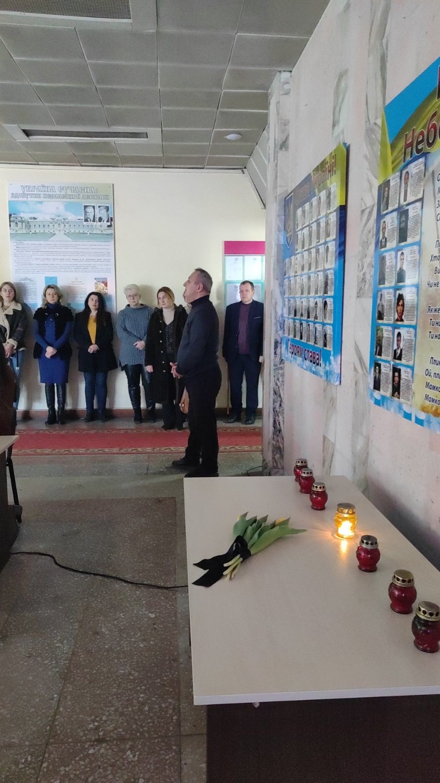 Студенти запалили свічки, згадали імена героїв, разом з отцем Андрієм прочитали молитву. А також ознайомилися з віршами українських поетів присвяченими Революції Гідності. Приємним сюрпризом було відео-звернення ношого студента, який навчався на спеціальності «Туризм» Максима Бевзи. Зараз він захищає нашу країну у складі батальйону бойових медиків. У відео Максим звернувся до студентів з закликом єднатися задля скорішої перемоги.