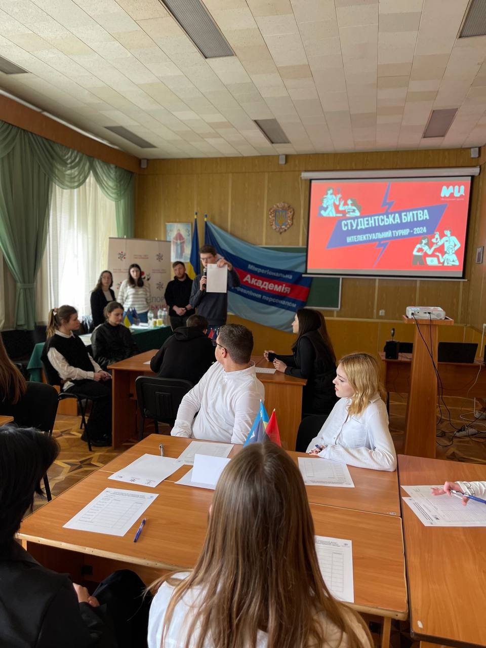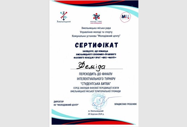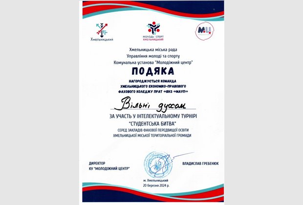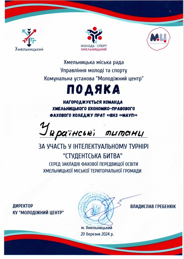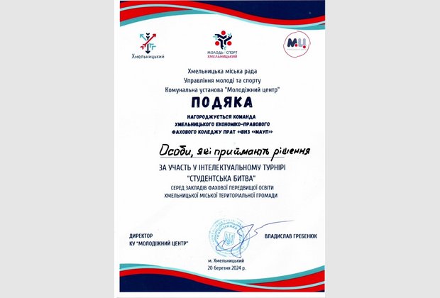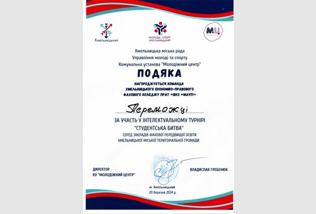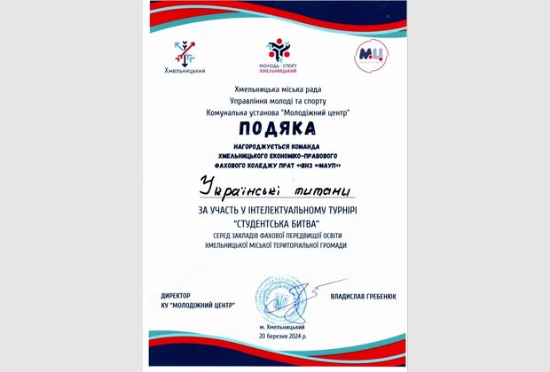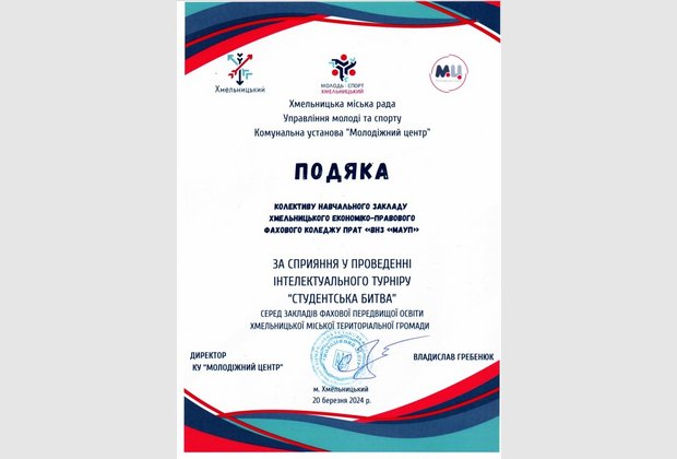 В стінах Хмельницького економіко-правового фахового коледжу МАУП відбувся інтелектуальний турнір «Студентська битва – 2024», захід організовано Молодіжним центром за сприянням Хмельницької міської ради.