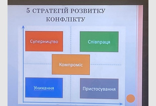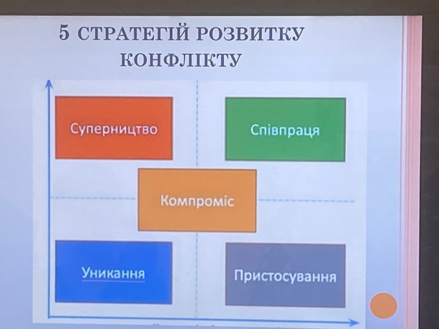 На практичному тренінгу розглянули варіанти конфліктів, як конфліктувати якісно та з позиції дорослої людини. Які можуть бути ризики та варіанти розвитку конфліктів. Обговорили існуючі стратегії розвитку конфліктів, їхні переваги та недоліки. До яких рішень можуть призвести конфлікти і як бути готовими, до того, щоб після конфлікту взяти відповідальність за своє життя.
