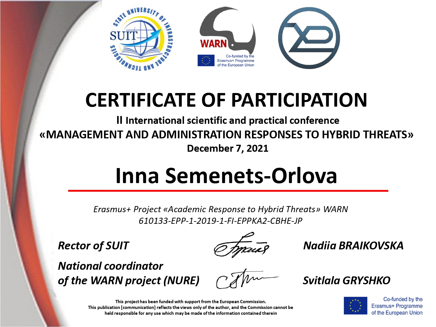 7 грудня 2021 р. відбулася друга Міжнародна науково-практична конференція «Управління та адміністрування в умовах протидії гібридним загрозам національній безпеці». Науковий захід був організований на базі Державного університету інфраструктури та технологій спільно з кафедрою управління економічною безпекою Харківського національного університету радіоелектроніки в рамках реалізації проекту Erasmus+ «Академічна протидія гібридним загрозам» WARN610133-EPP-1-2019-1-FI-EPPKA2-CBHE-JP. До участі у заході були запрошені викладачі кафедри публічного управління та адміністрування ННІУЕБ МАУП. Разом із науковцями закладів вищої освіти України та 9 зарубіжних країн викладачі ННІУЕБ долучилися до обговорення проблем безпеки, які залишаються актуальними в сучасному напруженому світі. Партнери Еразмус-проекту поділилися досвідом щодо термінології гібридних загроз, подискутували щодо визначення компетентностей майбутніх випускників, якими вони мають володіти для протидії гібридним впливам. Зарубіжні учасники заходу представили свої дослідження у сфері безпеки та розробки загальної стратегії економічної безпеки сучасних країн.