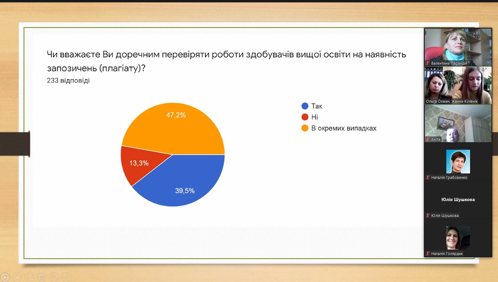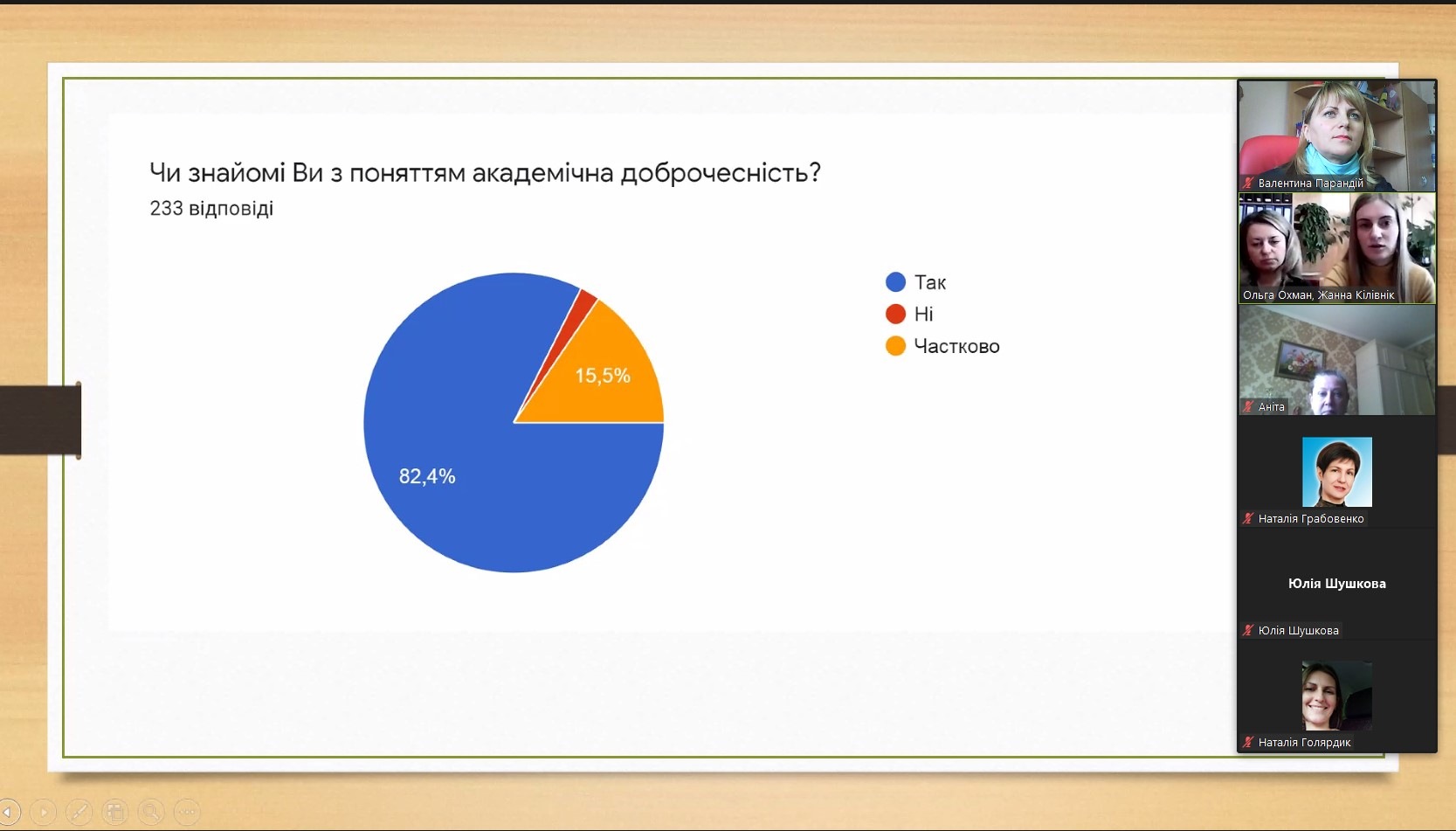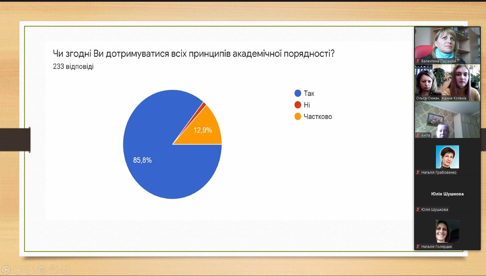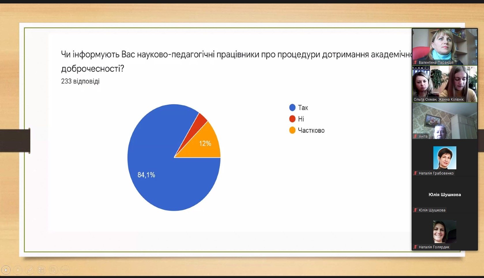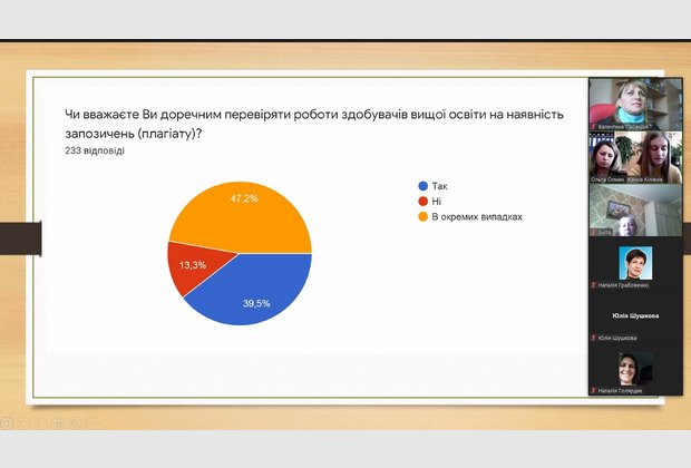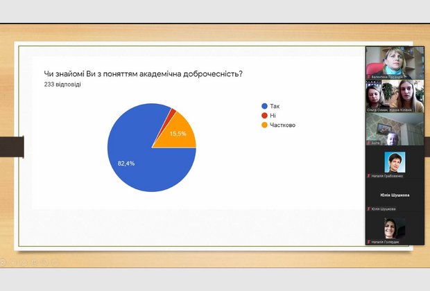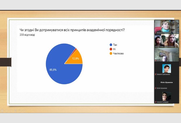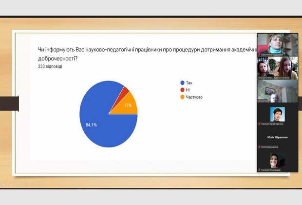 Цікавою виявилась презентація результатів проведеного опитування серед студентів, щодо дотримання академічної доброчесності під час реалізації освітньої програми. Результати презентували Голова наукового товариства студентів та молодих вчених Жанна Кілівнік та її науковий керівник доцент кафедри права та правоохоронної діяльності Ольга Василівна Охман.