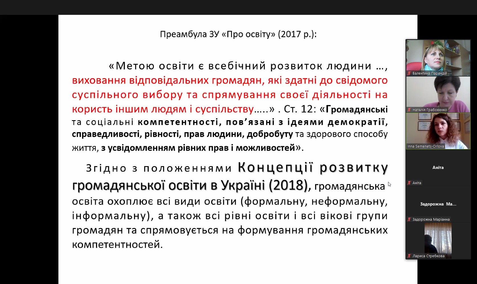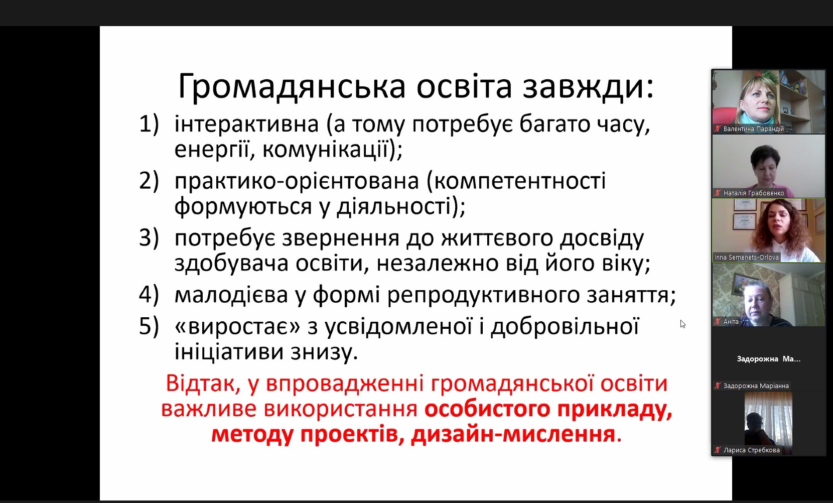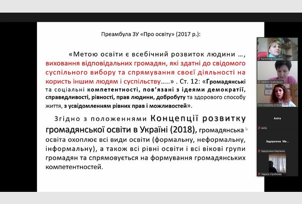 Надзвичайно цікавою була доповідь доктора наук з державного управління, директора Центру організації наукової роботи МАУП, тренера Ради Європи з громадянської освіти Інни Андріївни Семенець-Орлової. Вона зосередила увагу на широкому понятті академічної доброчесності та змусила усіх замислитися над сенсовим наповненням кожного проведеного заняття.