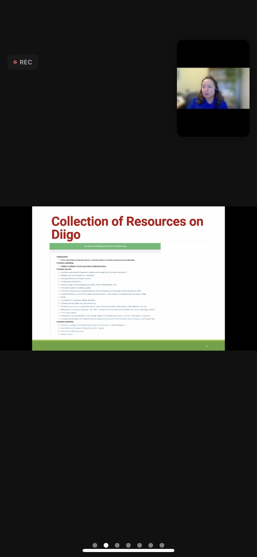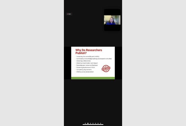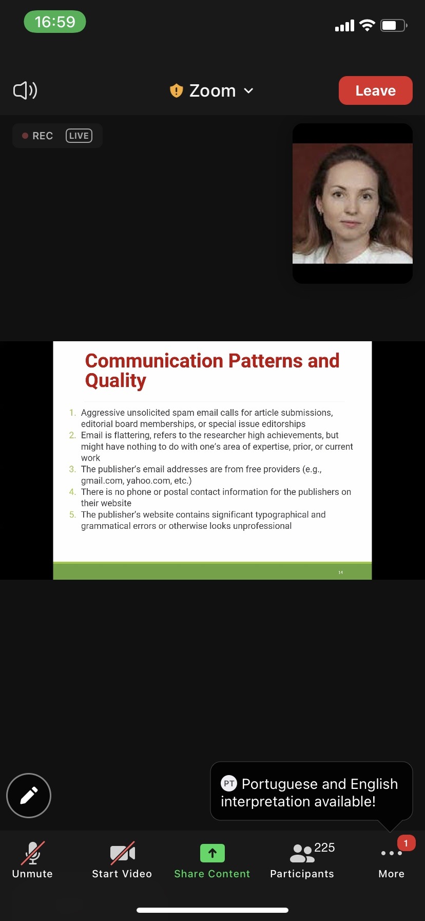 Спікерка Діна Вьорткіна, директорка Офісу інформації та навчальних технологій Коледжу освіти Університету штату Флорида, вивчає навчальні та освітні технології, інновації у вищій освіті і детальніше познайомила із поняттям «хижацькі видання» та які наслідки публікація у них несе для дослідників.