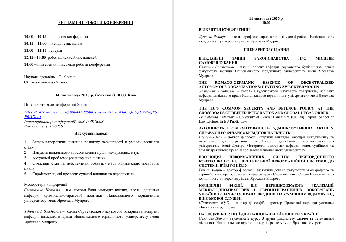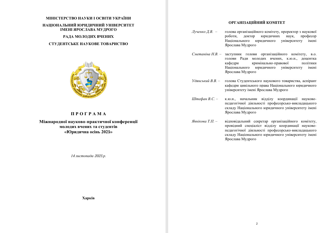 За результатами роботи конференції у грудні 2025 р. на сайті Національного юридичного університету імені Ярослава Мудрого буде розміщено збірник тез наукових доповідей та повідомлень учасників.