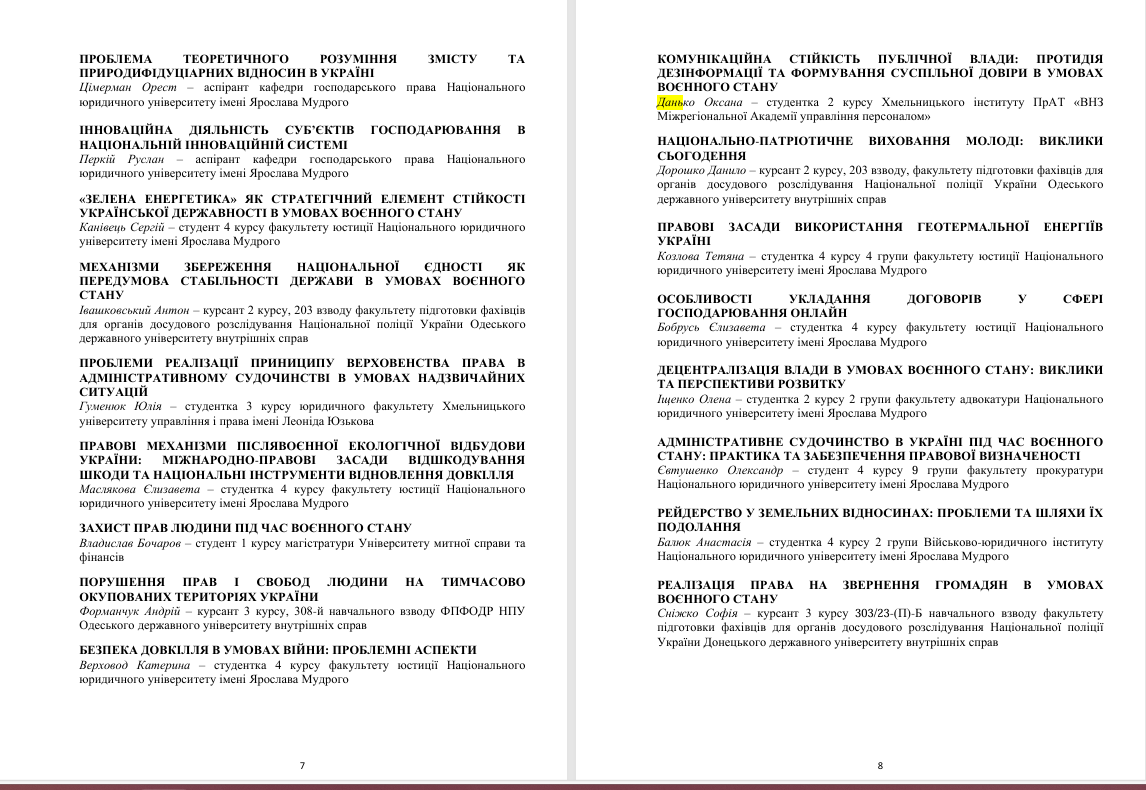 14 листопада 2025 року студентка Хмельницького інституту МАУП Оксана Данько взяла участь у міжнародній науково-практичній конференції «Юридична осінь 2025», що відбулася на базі Національного юридичного університету імені Ярослава Мудрого. Дослідження на тему «Комунікаційна стійкість публічної влади: протидія дезінформації та формування суспільної довіри в умовах воєнного стану» було виконано під керівництвом доцента кафедри права та правоохоронної діяльності, PhD Алли Авсієвич.