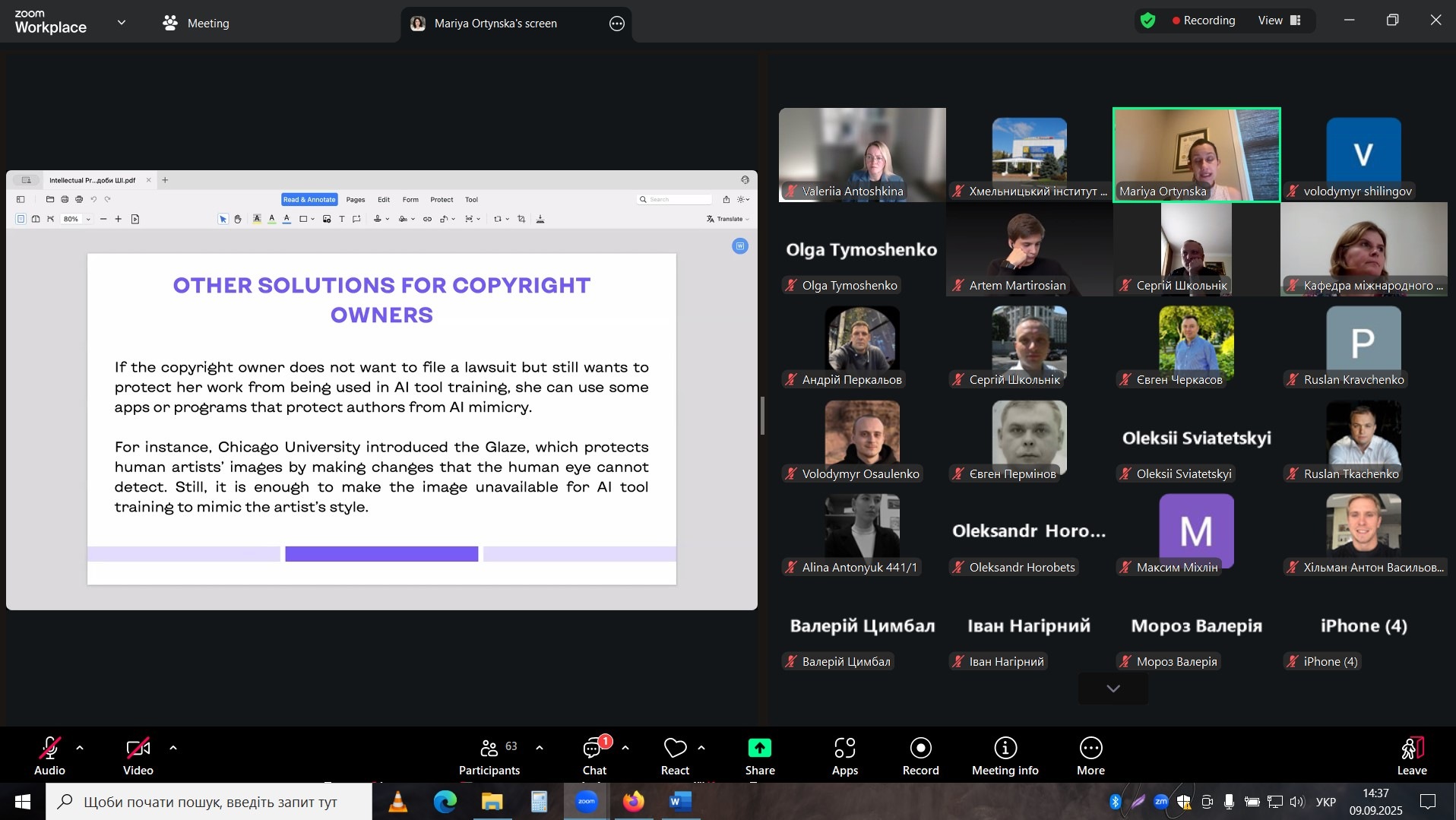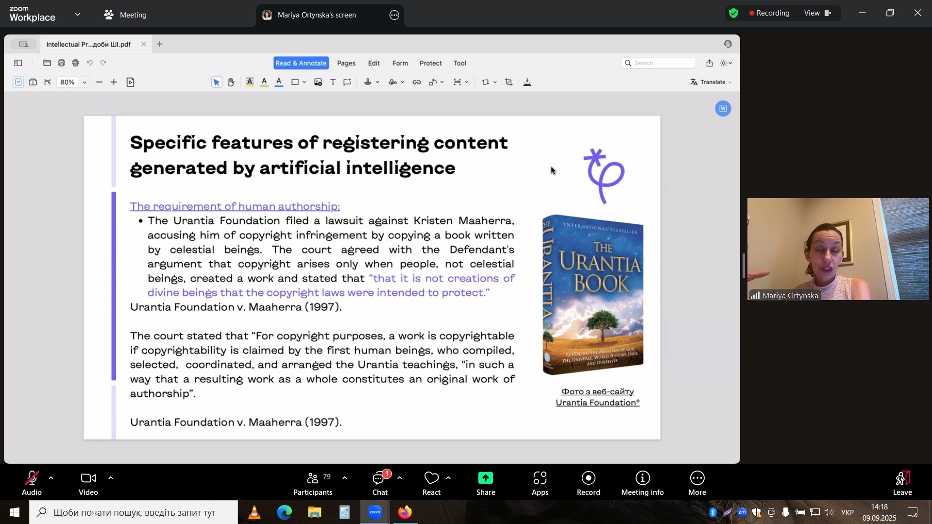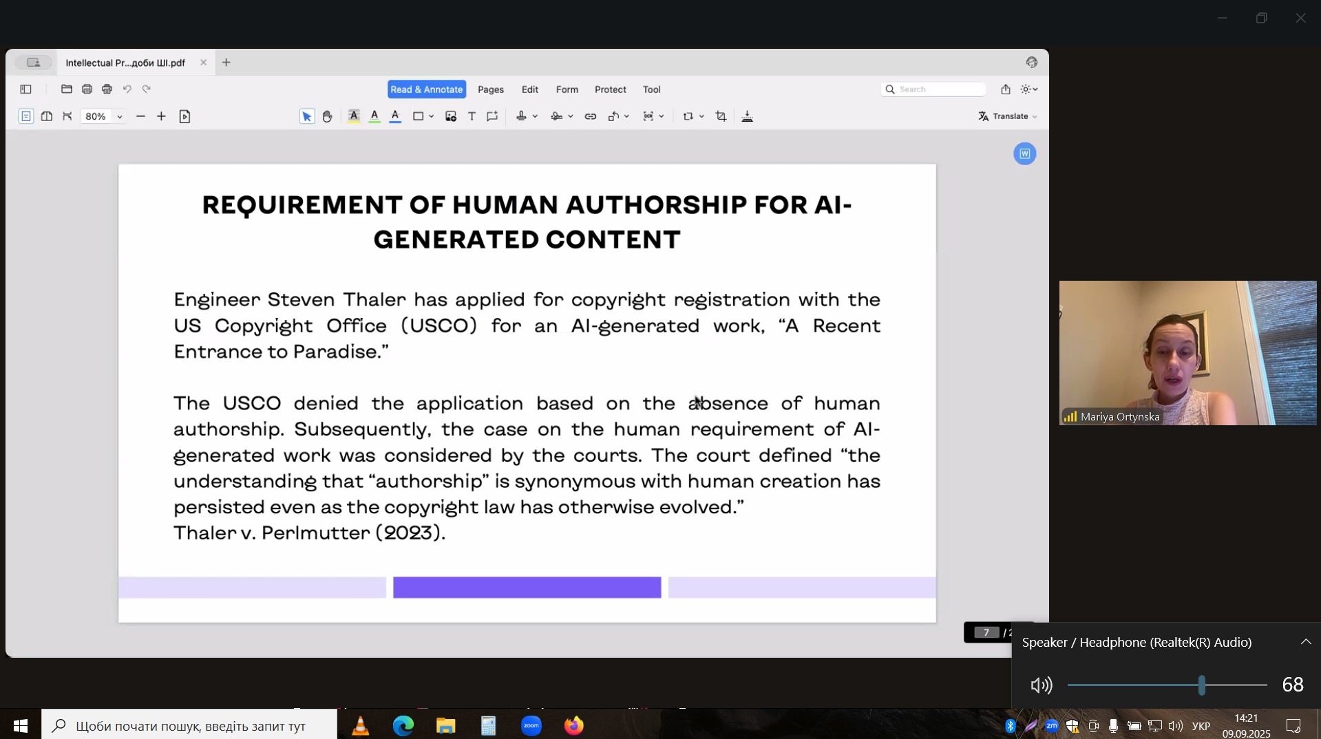 У своій лекції англійською мовою Марія Ортинська розповідала про право інтелектуальної власності в добу новітніх технологій: чи може контент, згенерований штучним інтелектом, бути захищений авторським правом; чи порушують ШІ-платформи права авторів книг, фотографій, зображень та інших творів; як штучний інтелект може застосовуватися у роботі юриста?