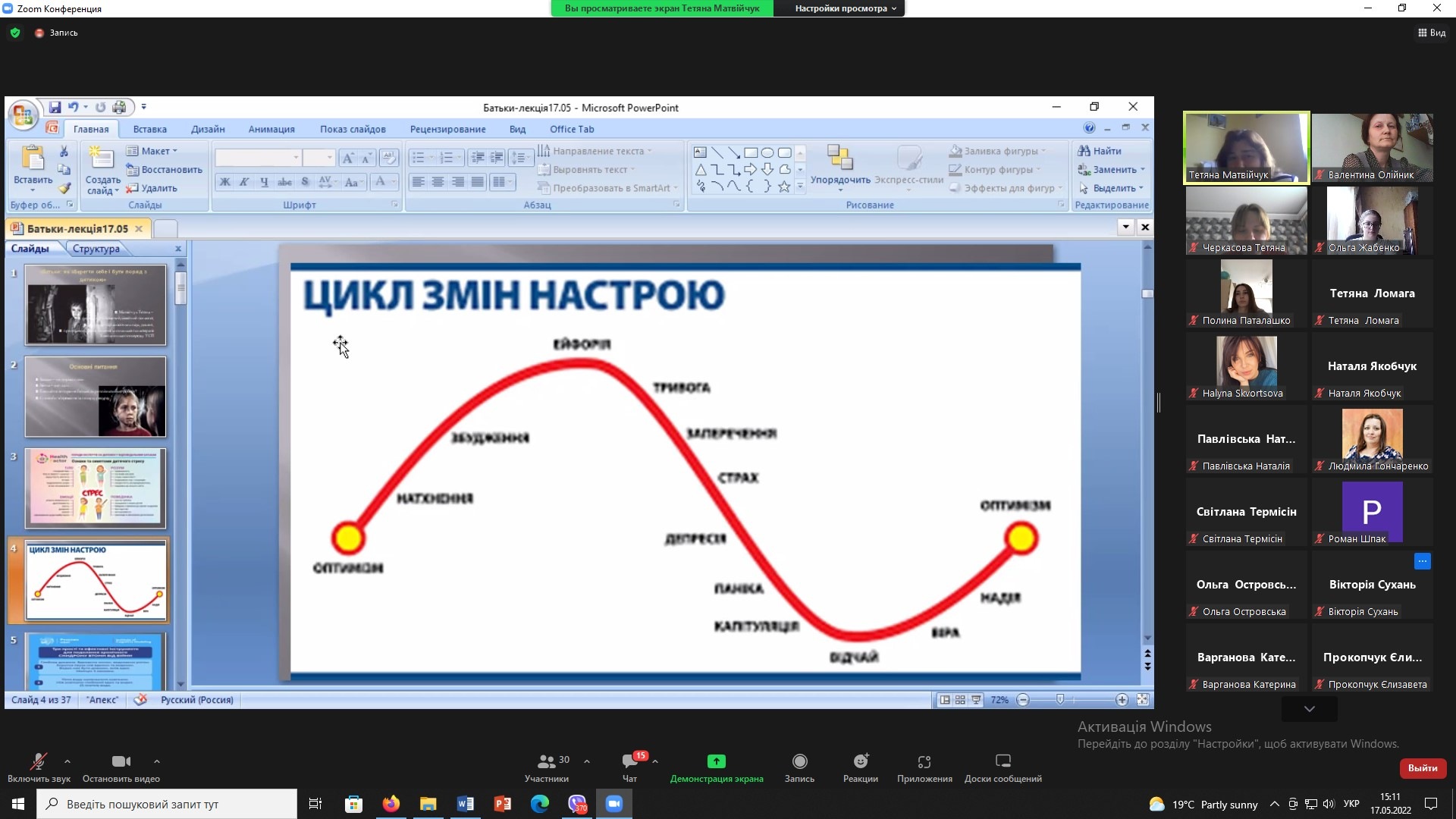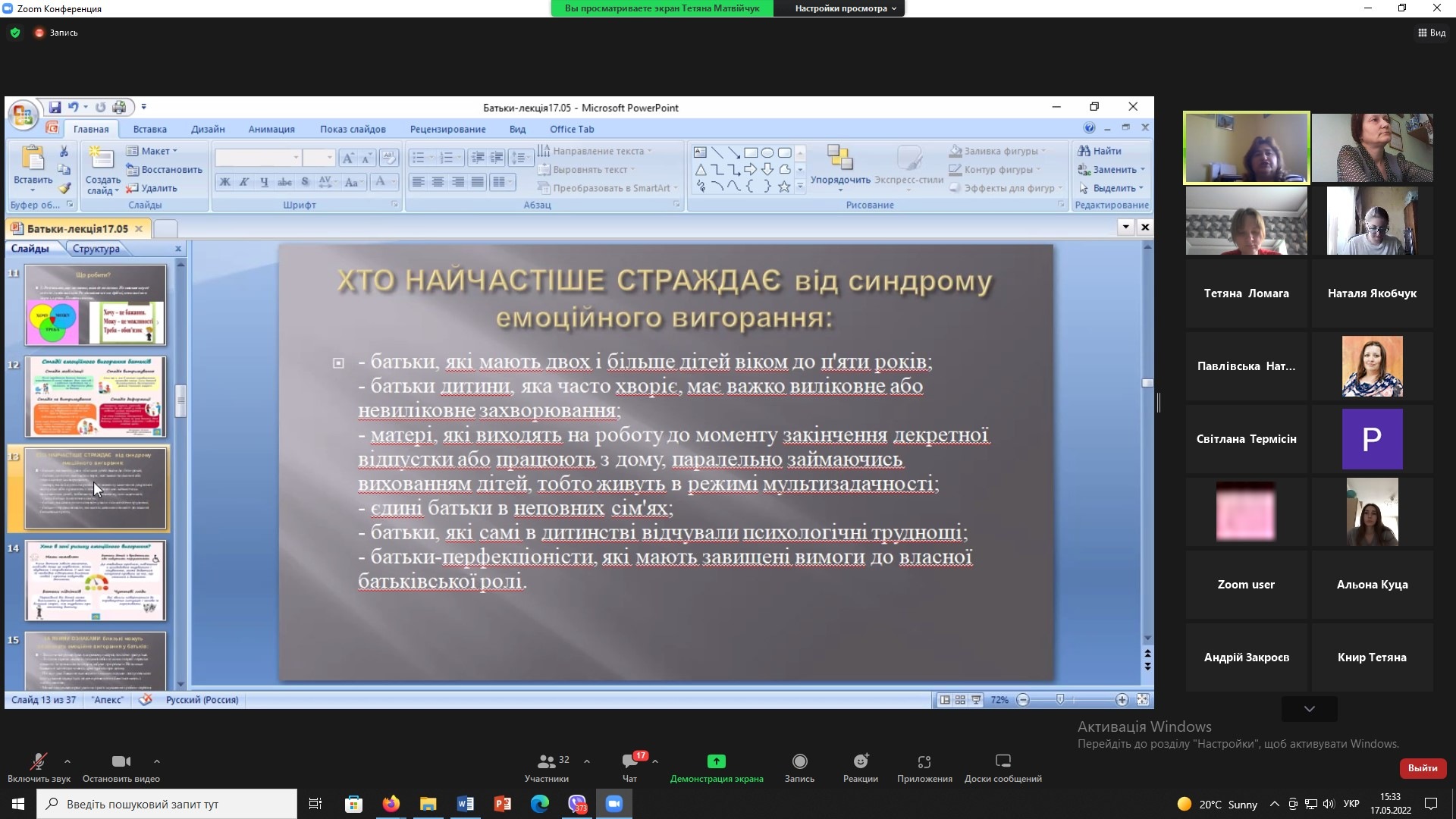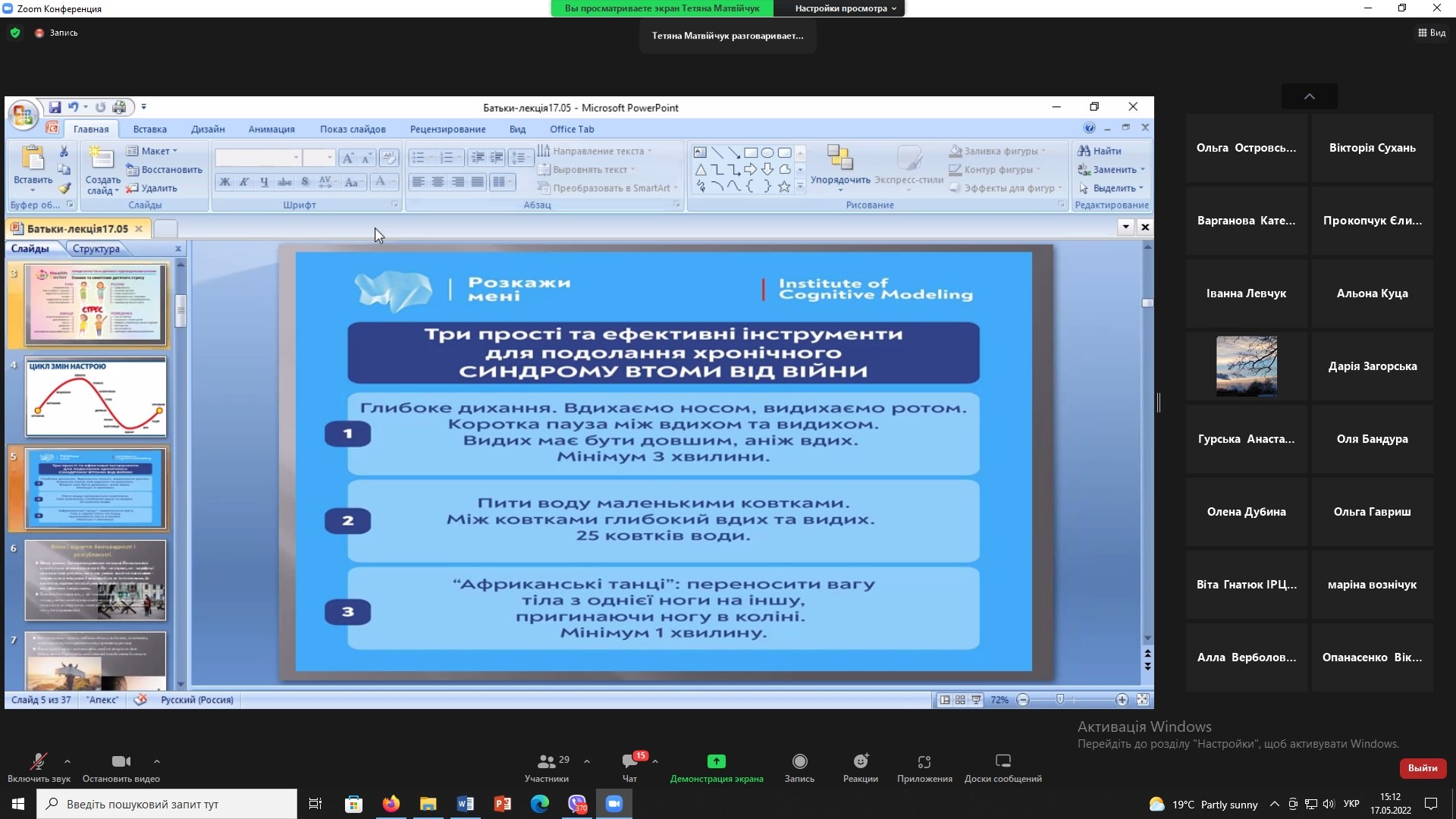 17 травня 2022 року здобувачі вищої освіти 1-4 курсів спеціальності «Психологія» і викладачі кафедри психології Хмельницького інституту МАУП взяли участь у черговій тематичній лекції «Батьки: як зберегти себе і бути поряд із дитиною».