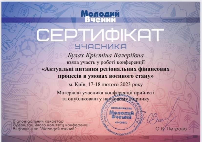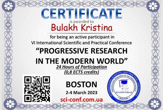 В УМОВАХ ВОЄННОГО СТАНУ», яка відбулася 17-18 лютого 2023 року, а також 4 березня 2023 року взяла участь у VI Міжнародній науково-практичній конференції “PROGRESSIVE RESEARCH IN THE MODERN WORLD”, м. Бостон, США.