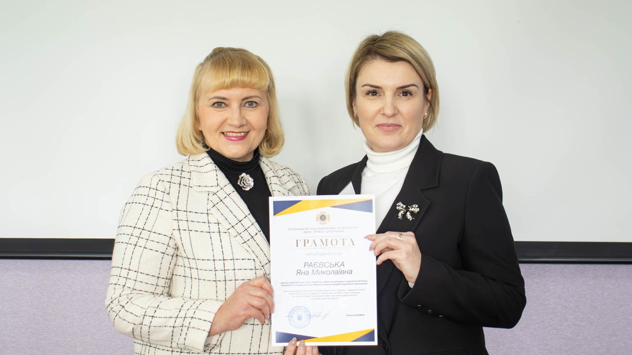 Яна Раєвська нагороджена грамотою Луганського національного університету імені Тараса Шевченка (м. Лубни) за популяризацію передового науково-педагогічного досвіду, підвищення якості освітнього процесу, академічну мобільність, активну плідну співпрацю на ниві розбудови національної освіти, високий професіоналізм та активну життєву позицію.