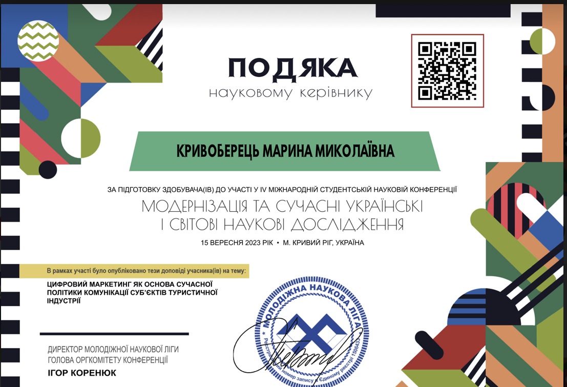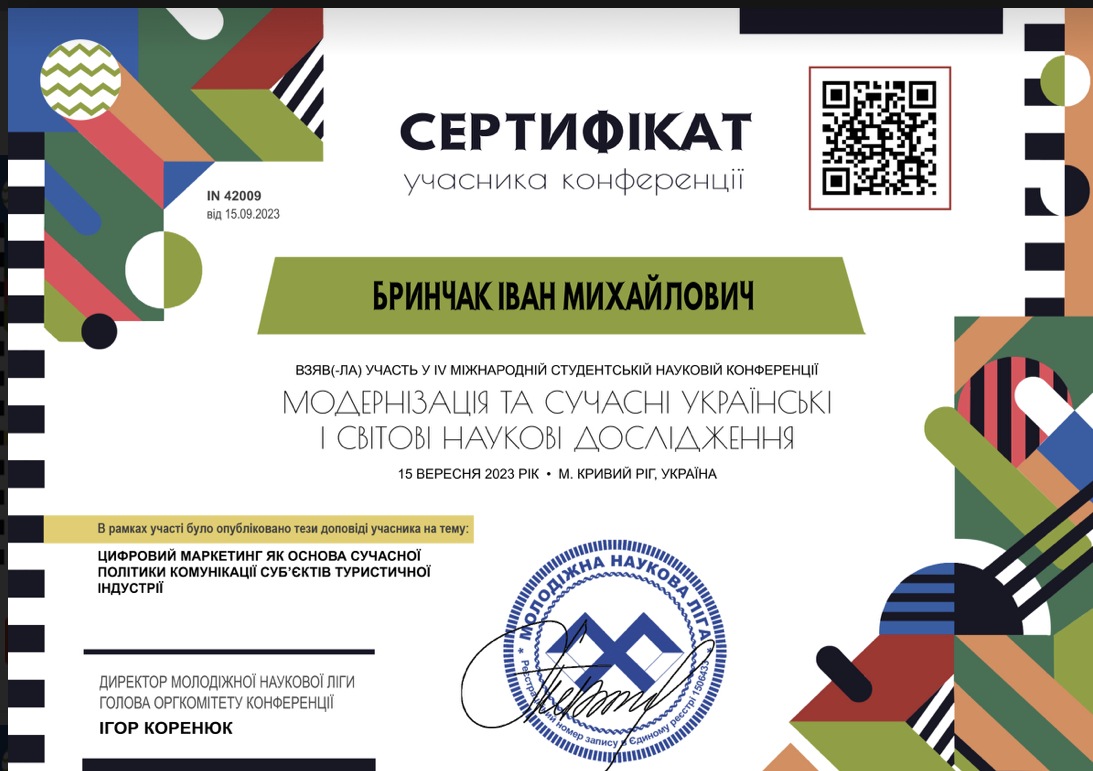 15 вересня 2023 року студент 4 курсу спеціальності 242 «Туризм» Навчально-наукового інституту управління, економіки та бізнесу Бринчак І.М. взяв участь у IV Міжнародній студентській науковій конференції «Модернізація та сучасні українські і світові наукові дослідження».