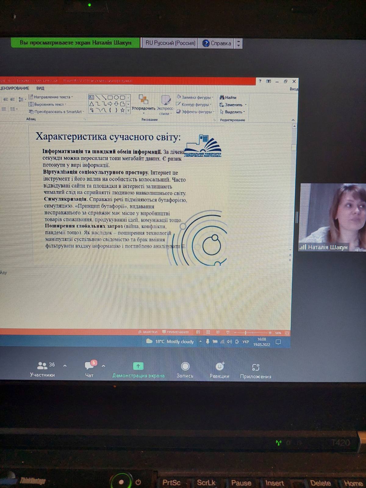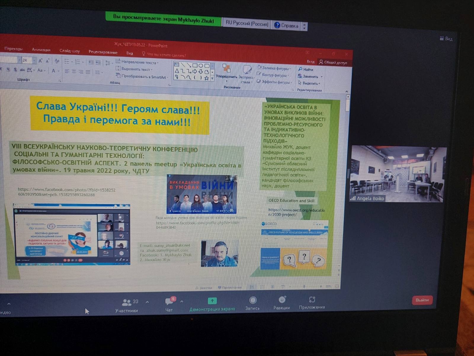 19 травня 2022р. д.ф.н., доц., зав.кафедри загальнонаукових, соціальних та поведінкових дисциплін Одеського інституту МАУП Нерубассько Алла Олександрівна взяла участь у VIII Всеукраїнській науково-теоретичній конференції "Соціальні та гуманітарні технології: філософсько-освітній аспект", яка відбулася в Черкаському державному технологічному університеті на платформі Zoom.