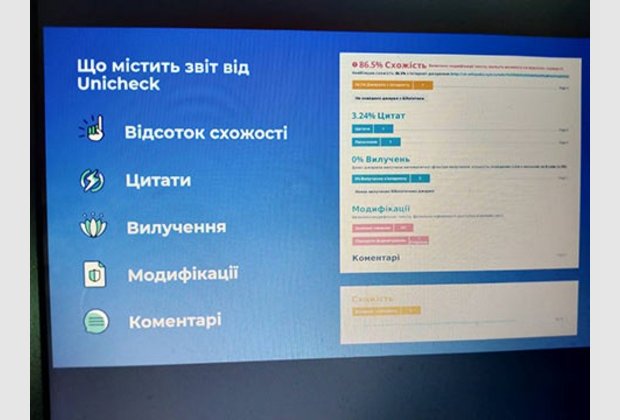 Експерти перевірки робіт в антиплагіатній системі Unicheck Одеського інституту ПрАТ «ВНЗ «МАУП» 22 квітня взяли участь у всеукраїнському вебінарі «Аналізуємо звіт про перевірку на плагіат». На вебінарі були розглянуті основні аспекти звіту подібності, який формується після перевірки роботи на плагіат, практичні кейси, роз'яснено, як синергії людини та машини дають найкращі результати перевірки.