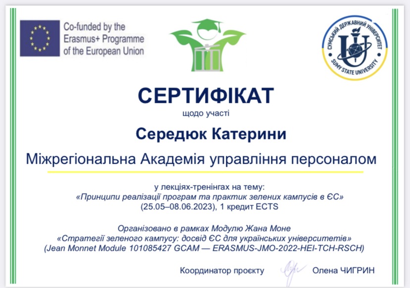 З 25.05 по 08.06.2023 року заступник завідувача Кафедра Менеджменту ПрАТ “ВНЗ «МАУП» док.філ. у гал. екон., доцент Середюк К.В. взяла участь у лекціях-тренінгах «Принципи реалізації програм та практик зелених кампусів в ЄС».