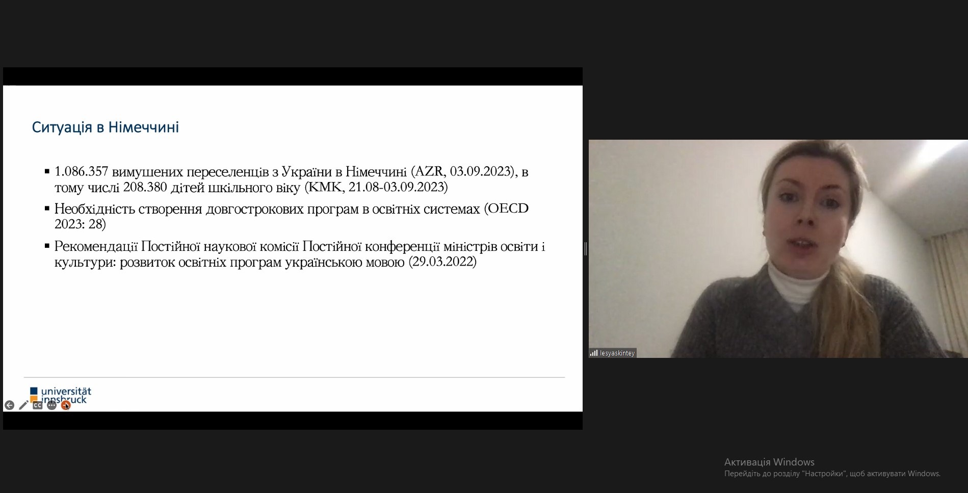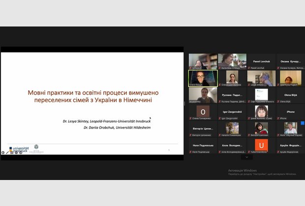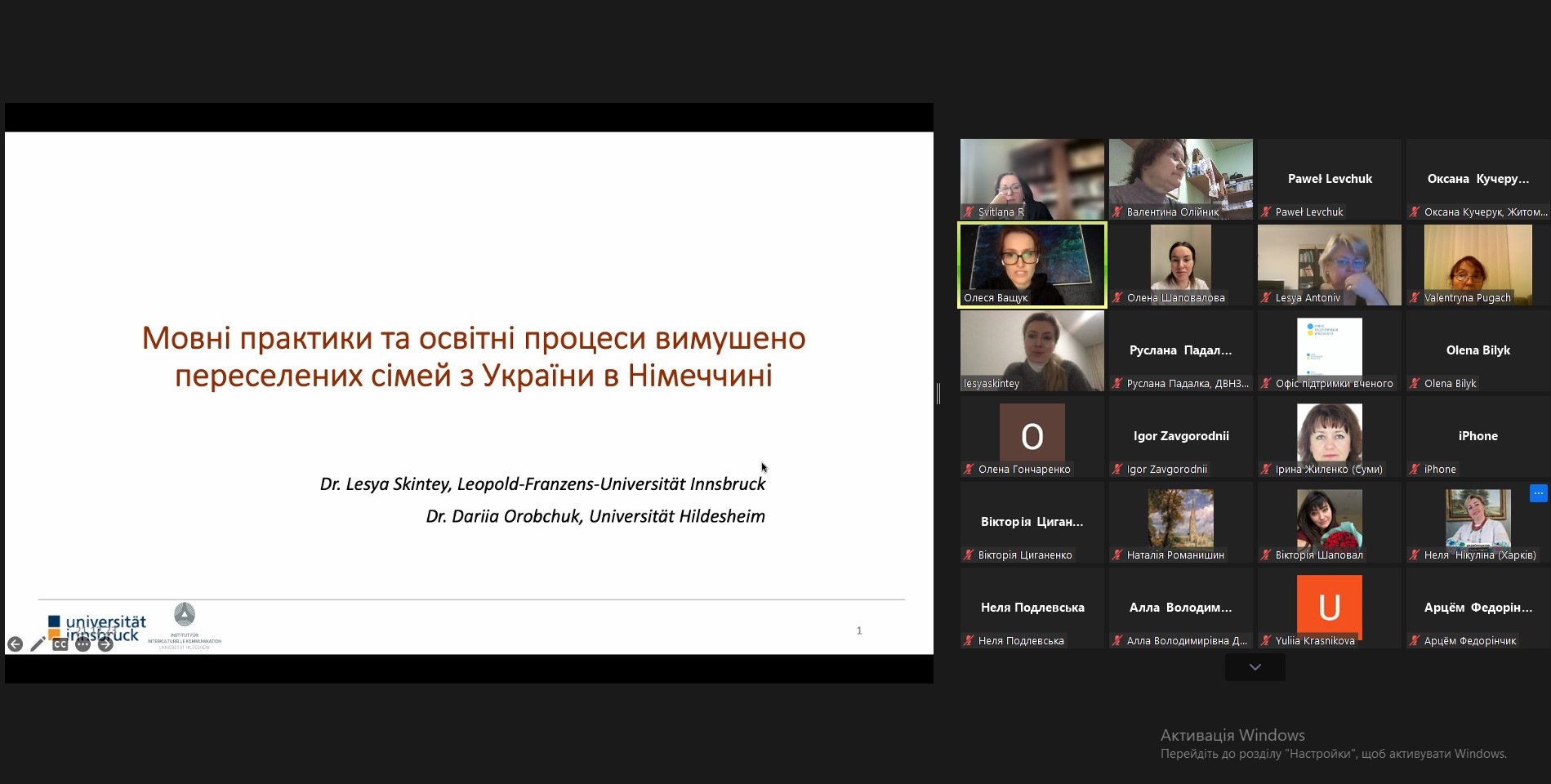 Про мовні практики та освітні процеси вимушено переселених сімей з України в Німеччині розповіли Леся СКІНТЕЙ, доктор гуманітарних наук, інститут германістики, Інсбрукський Університет ім. Леопольда Франценса та Дарина ОРОБЧУК, доктор гуманітарних наук, інститут міжкультурної комунікації, Університет Гільдесгайма.
