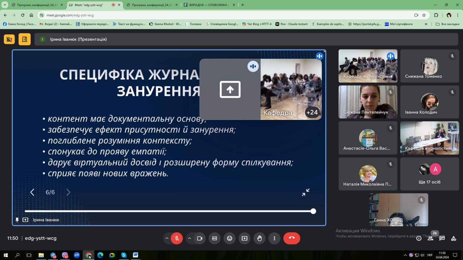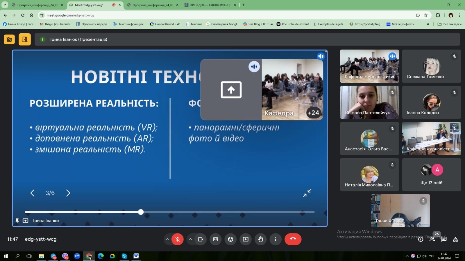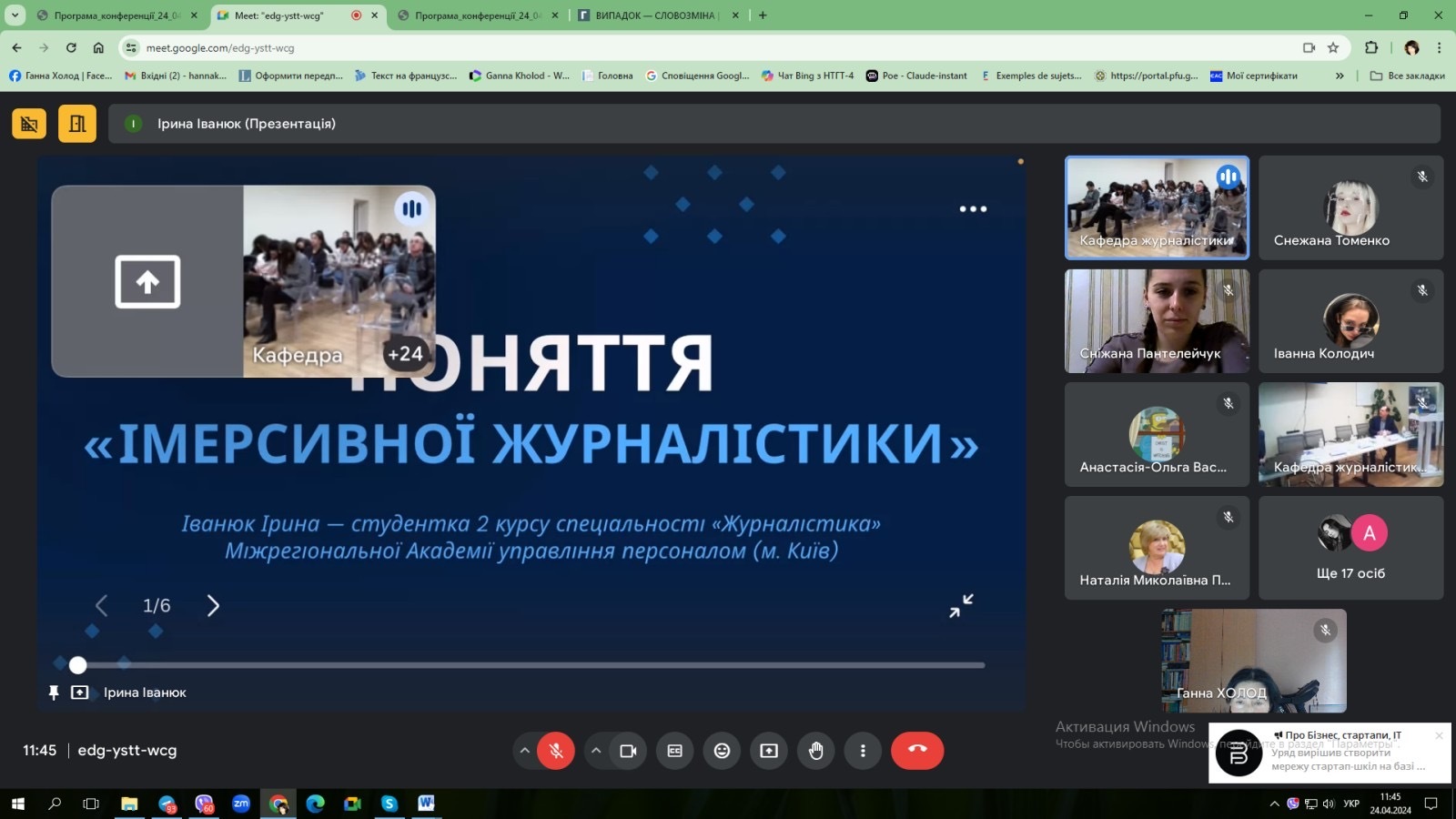 24 квітня 2024 року здобувачки вищої освіти кафедри журналістики: Євгенія Бірюкова, Ірина Іванюк, Сніжана Пантелейчук - узяли участь у Всеукраїнській студентській науково-практичній конференції "Інтернет-журналістика та новітні технології в сучасних медіа". Для участі в конференції здобувачки вищої освіти дослідили такі теми: "Специфіка діяльності конвергентних редакцій (на прикладі «РАДІО СВОБОДА» ТА «KYIV POST»)" (Сніжана Пантелейчук), "Поняття "імерсивна журналістика"" (Ірина Іванюк), "Інструменти виявлення діпфейку на прикладі сучасних матеріалів" (Євгенія Бірюкова).