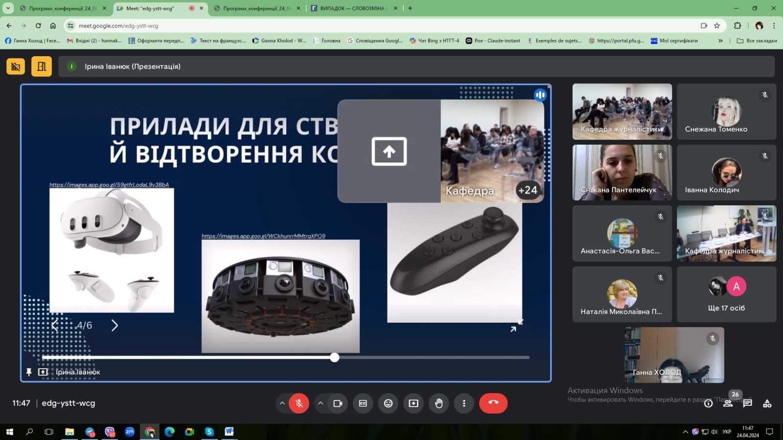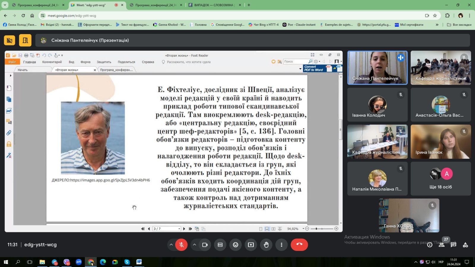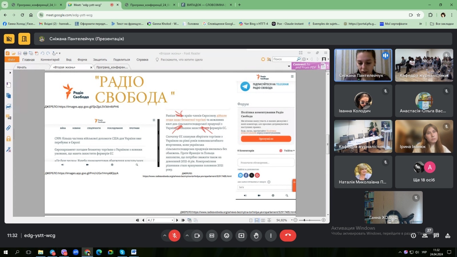 24 квітня 2024 року здобувачки вищої освіти кафедри журналістики: Євгенія Бірюкова, Ірина Іванюк, Сніжана Пантелейчук - узяли участь у Всеукраїнській студентській науково-практичній конференції "Інтернет-журналістика та новітні технології в сучасних медіа". Для участі в конференції здобувачки вищої освіти дослідили такі теми: "Специфіка діяльності конвергентних редакцій (на прикладі «РАДІО СВОБОДА» ТА «KYIV POST»)" (Сніжана Пантелейчук), "Поняття "імерсивна журналістика"" (Ірина Іванюк), "Інструменти виявлення діпфейку на прикладі сучасних матеріалів" (Євгенія Бірюкова).