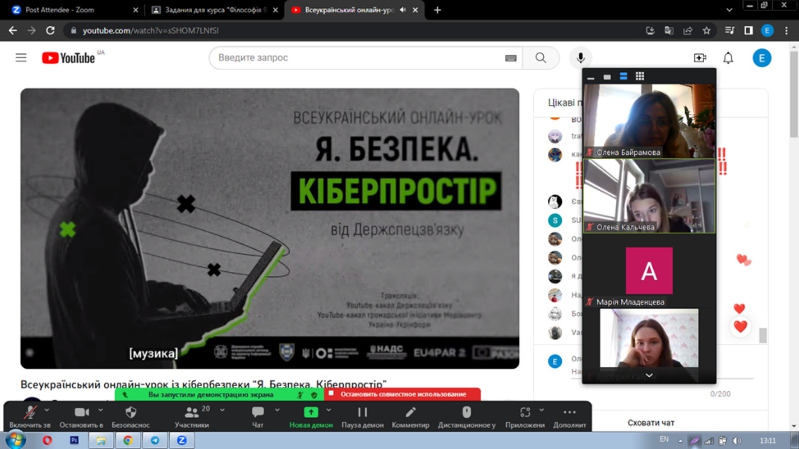 Всеукраїнський онлайн-урок був присвячений правилам кібергігієни для мешканців України. Здобувачі освіти дізнались про фінансові листи та їх ознаки; кібератаки та правила безпечної роботи із сайтами. Студентам розповіли про кібермарадьорів.