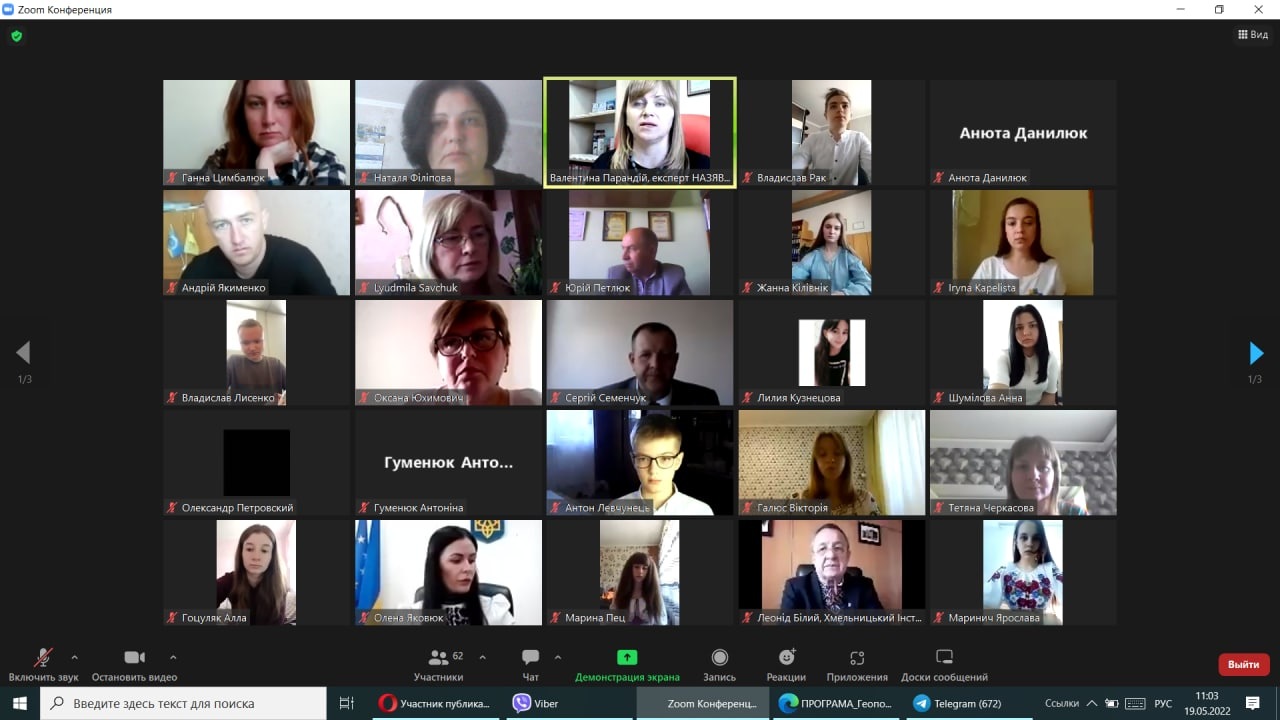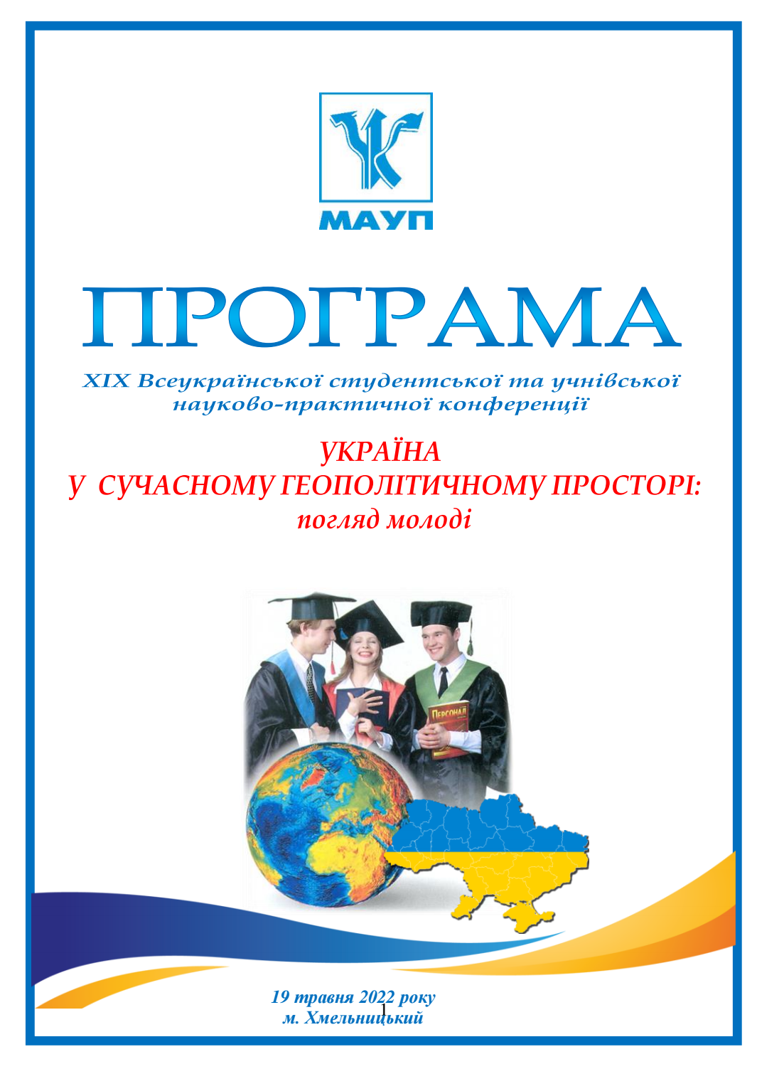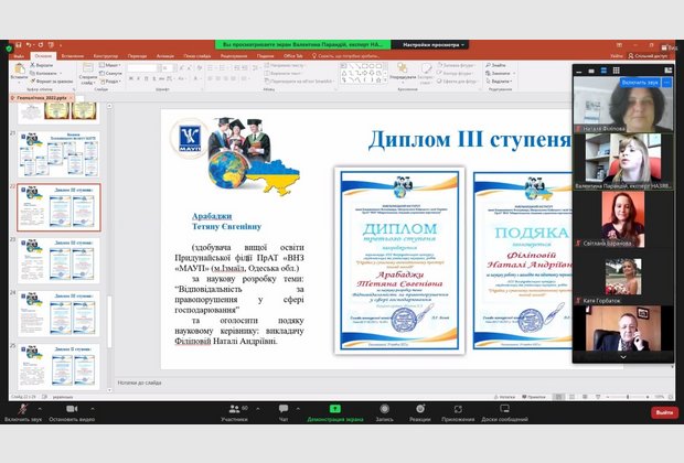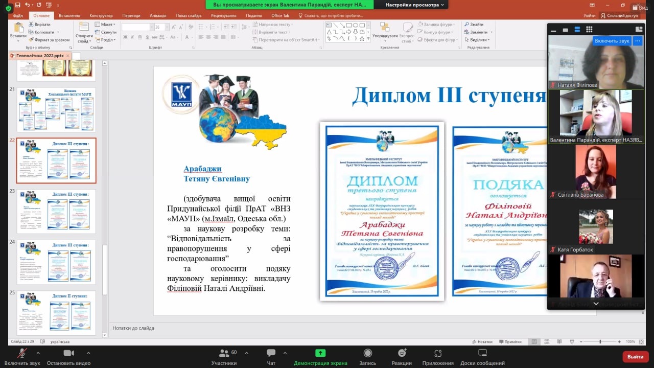 Здобувачі вищої освіти та НПП Придунайської філії ПрАТ "ВНЗ "МАУП" взяли участь у ХІХ Всеукраїнській студентській та учнівській науково-практичній конференції "Україна у сучасному геополітичному просторі: погляд молоді", яка відбулася 19 травня 2022 року на базі Хмельницького інституту імені Блаженнішого Володимира, Митрополита Київського і всієї України ПрАТ "ВНЗ "МАУП".