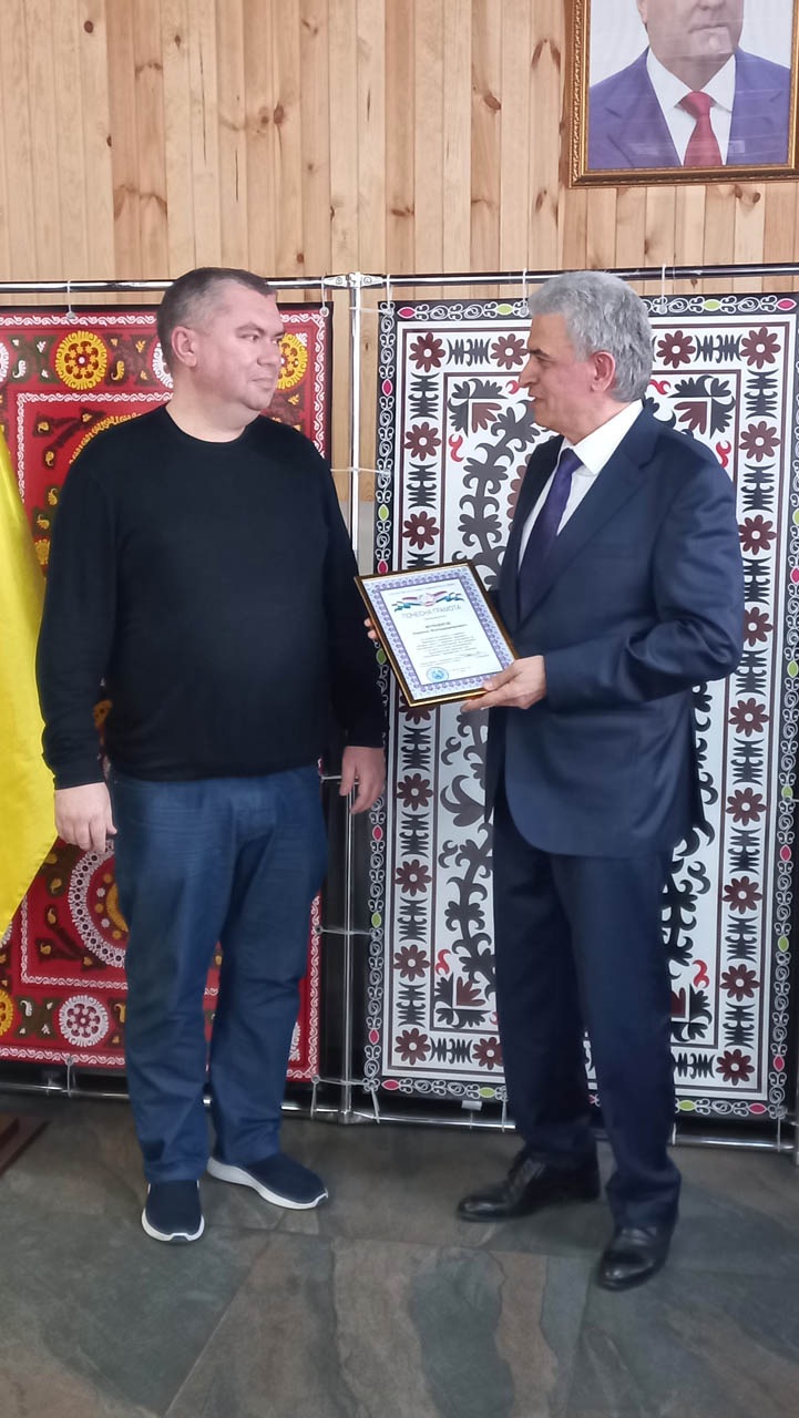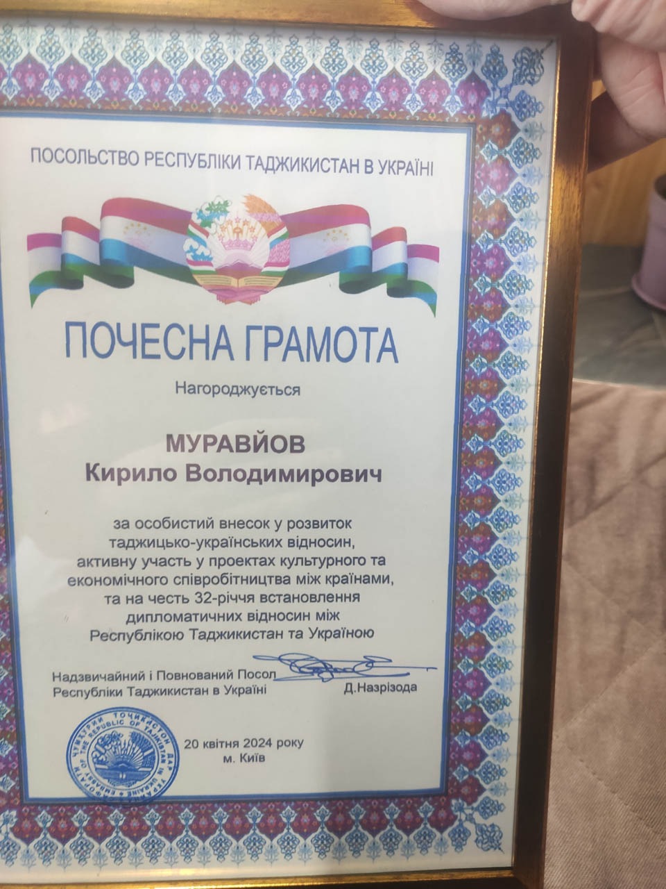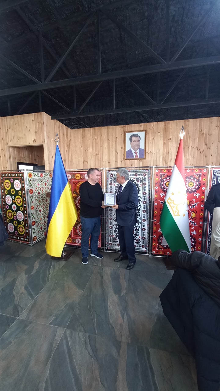 Пан Посол високо оцінив започатковане співробітництво між Посольством та Академією та нагородив ректора Академії Кирила Муравйова Почесною грамотою за особистий внесок у розвиток таджицько-українських відносин, активну участь у проєктах культурного та економічного співробітництва між країнами, та на честь 32-річчя встановлення дипломатичних відносин між Україною та Республікою Таджикистан.