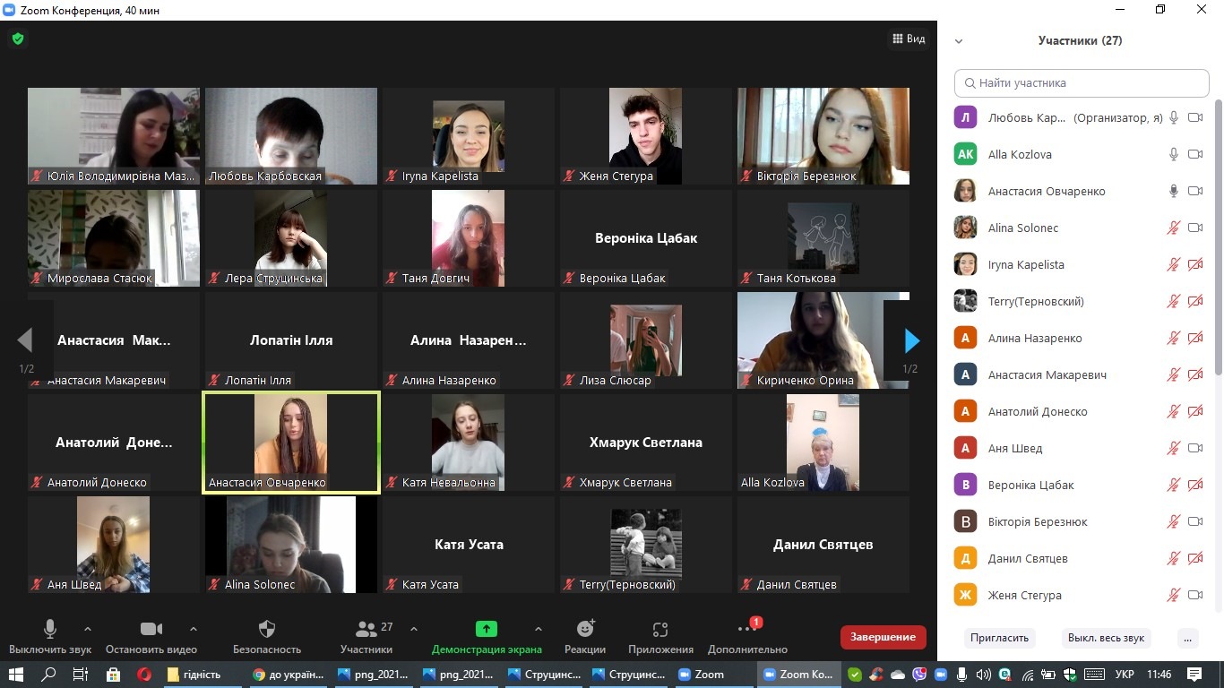 До Дня Гідності та Свободи студенти ННІУЕБ та їх куратори Карбовська Л.О. та Мазур Ю.В. провели усний онлай-журнал «День Свободи і Гідності». До виховного заходу долучилися провідний науковий співробітник Центру організації наукової роботи Капеліста І.М. та заступник завідувача кафедри економіки та управління бізнесом Козлова А.І. Всіх надихнуло відео на пісню «До українців» (на вірш Віктора Баранова). Наразі своїм сприйняттям змісту понять «свобода» і «гідність» поділилися студенти. Для Анастасії Овчаренко свобода – це, в першу чергу, свобода вибору. Березнюк Вікторія вважає, що гідність – це не просто сукупність людських рис, що характеризують позитивні моральні якості, а дещо більше. Стегура Євгеній представив свої роздуми у вигляді зорових образів – картинок. У Струцинської Валерії – це есе-візуалізація у вигляді інтерактивних карт. Цікаво були прослухати також роздуми-есе студентів: у Невальонної Катерини – це «Ми - ровесники Помаранчевої революції", Стасюк Мирослава представила роздуми на тему «Що для мене є Свобода?». Швед Анна поділилася думкою про те, у чому Гідність українців. Донеско Анатолій підготував есе на тему «Що для мене є гідність?»