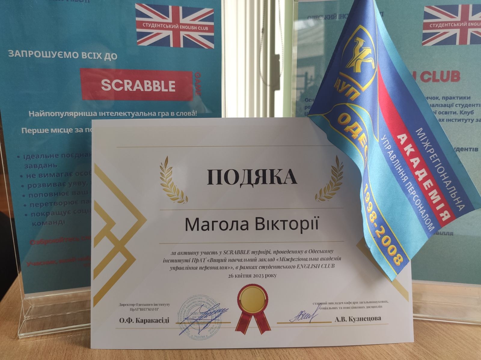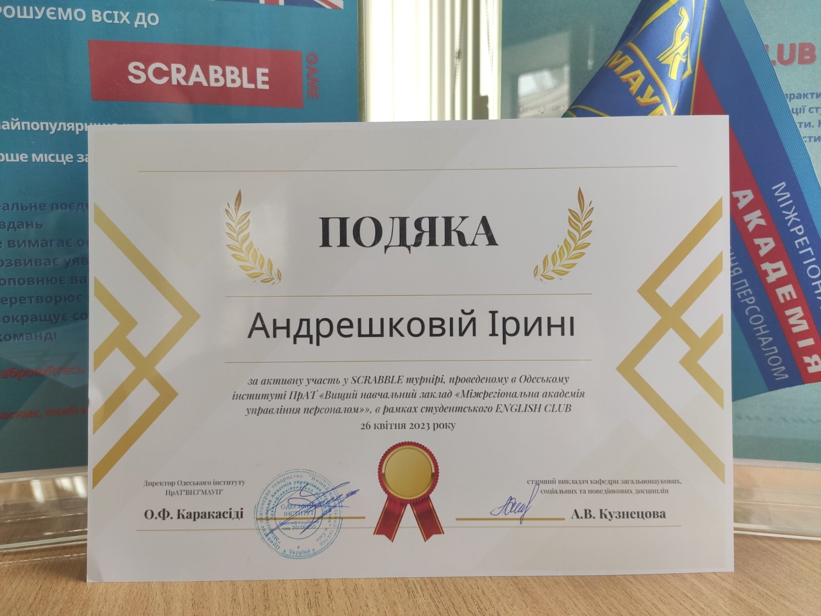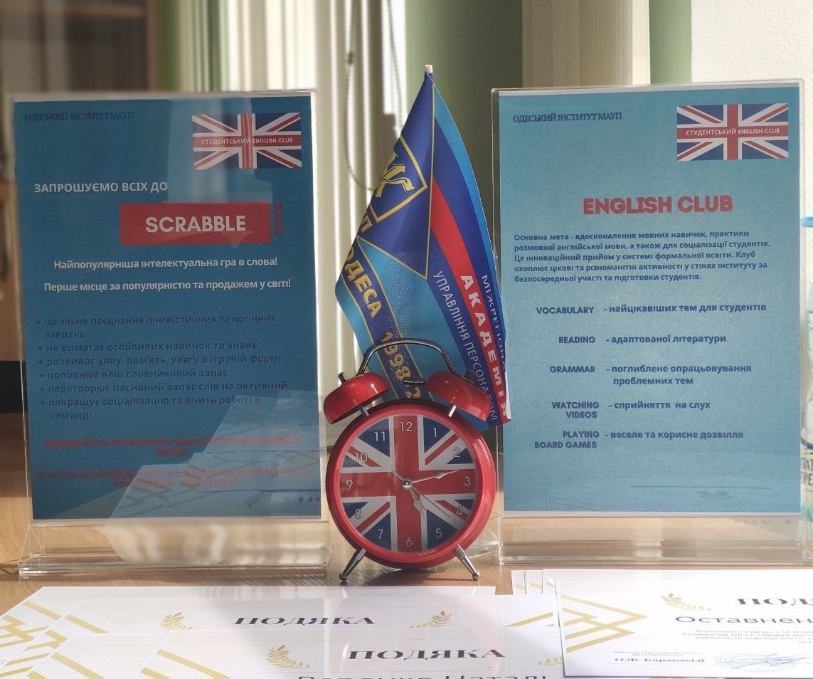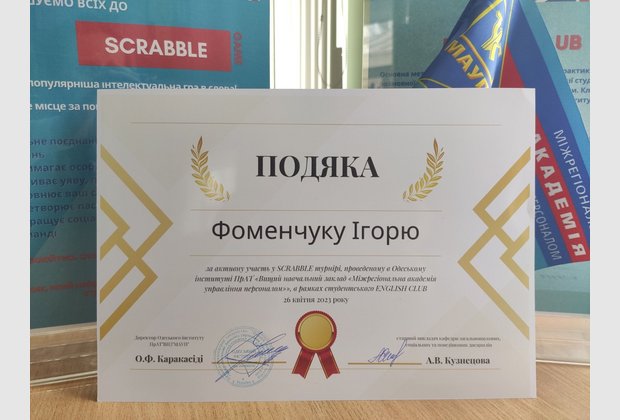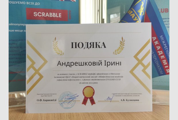 26 квітня 2023 року в Одеському інституті МАУП в рамках студентського ENGLISH CLUB під керівництвом старшого викладача кафедри загальнонаукових, соціальних та поведінкових дисциплін Анастасії Кузнецової пройшов турнір найпопулярнішої інтелектуальної гри в слова – SCRABBLE.