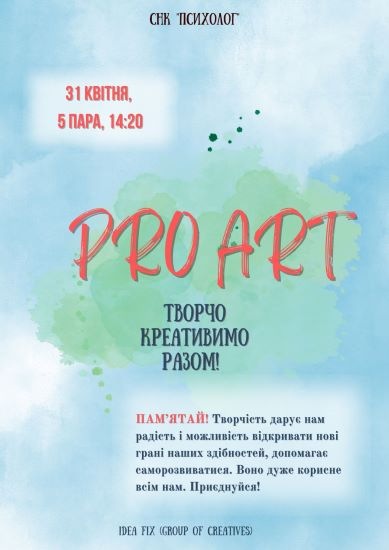 31 березня 2023 року в Одеському інституті МАУП студентський науковий клуб «ПСИХОЛОГ» провів черговий PRO-ART, який вже став традиційним та улюбленим серед студентів.