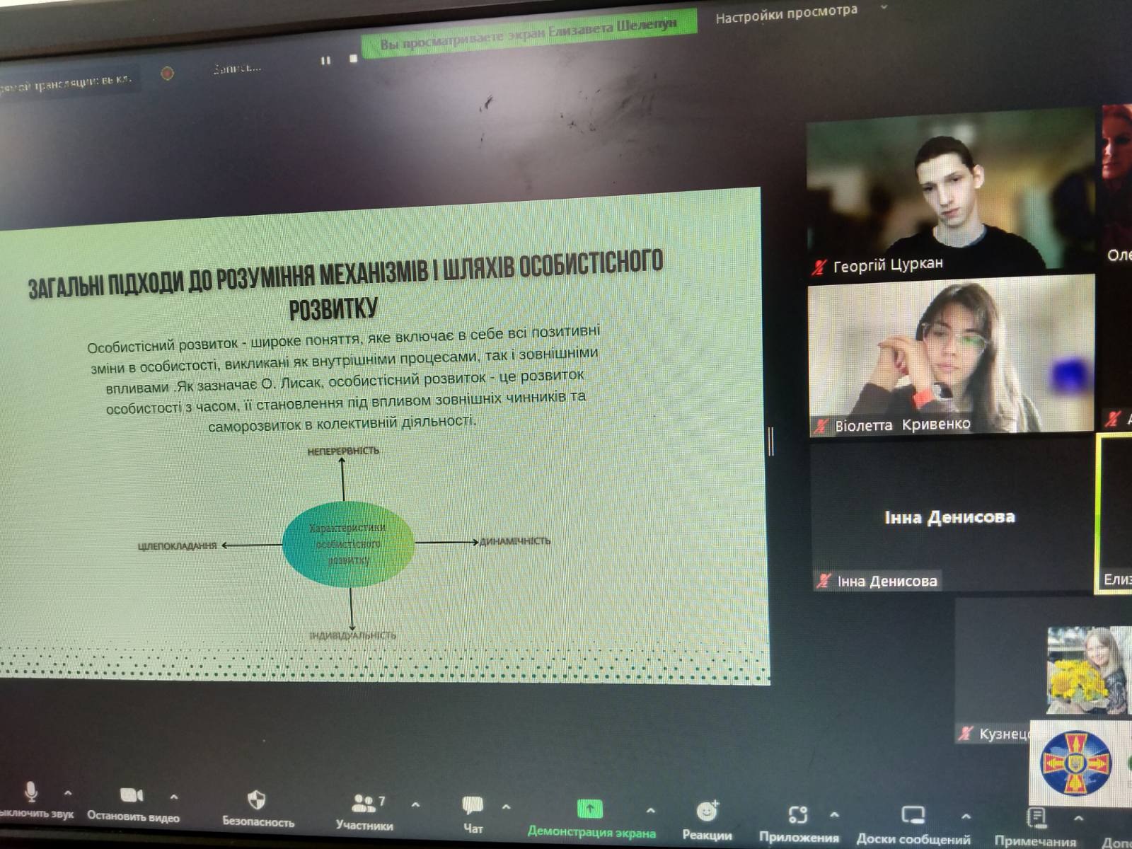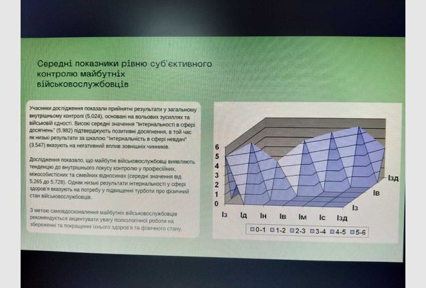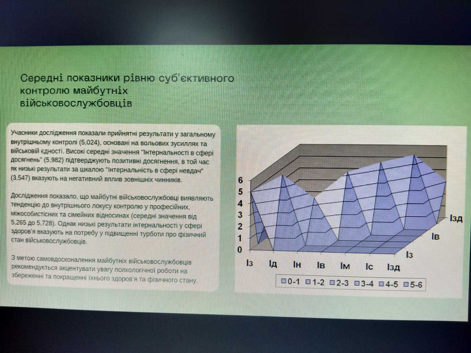 -студентка 3 курсу спеціальності Психологія, заступник Голови НТСМВ Єлизавета Шелепун (наук.керівник - к.психол.н., доцент Крюкова М.А.) дослідила роботу психолога з розвитку самовдосконалення майбутніх військових і презентувала результати власного психологічного опитування 50 курсантів Військової Академії - майбутніх українських офіцерів;