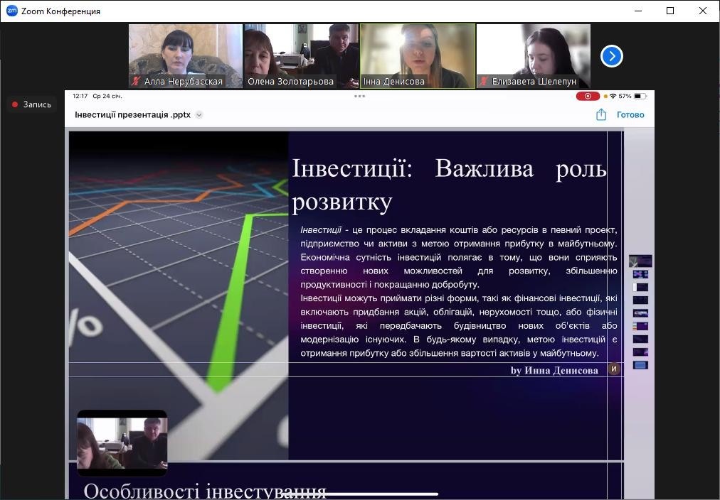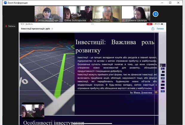 -студентка 4 курсу спеціальності Менеджмент, Голова Клубу "М:АНГО" Інна Денисова (наук.керівник - к.е.н. Кузнєцова О.В.) проаналізувала теоретичні аспекти дослідження інвестиційної діяльності;