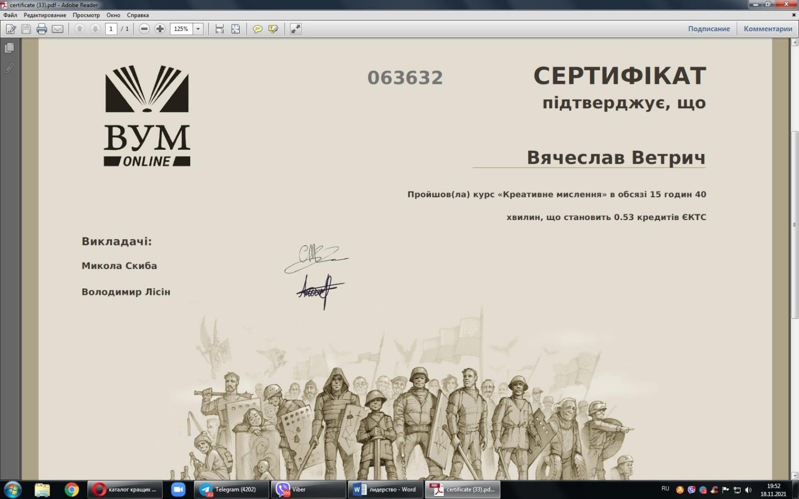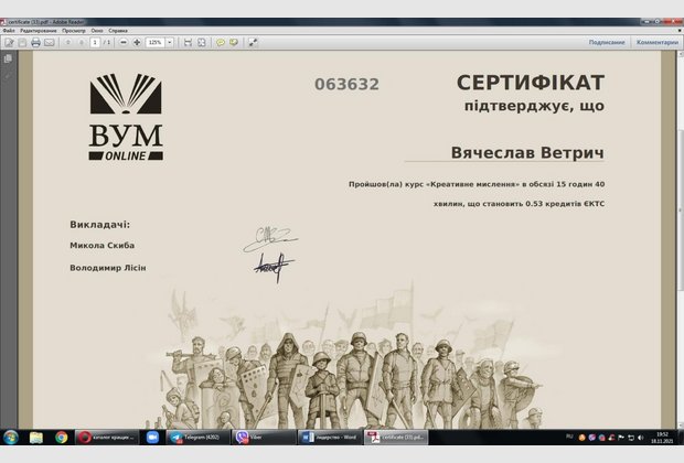 Здобувачі освіти І курсу Придунайської філії під час вивчення змістовних модулів з навчальної дисципліни «Філософія» також пройшли навчання на освітній платформі громадянської освіти ВУМ online з курсів «Сталий розвиток: нова філософія мислення», «Школа ефективного мислення», «Креативне мислення», «Вступ до критичного мислення» та отримали відповідні сертифікати після успішного проходження курсів.