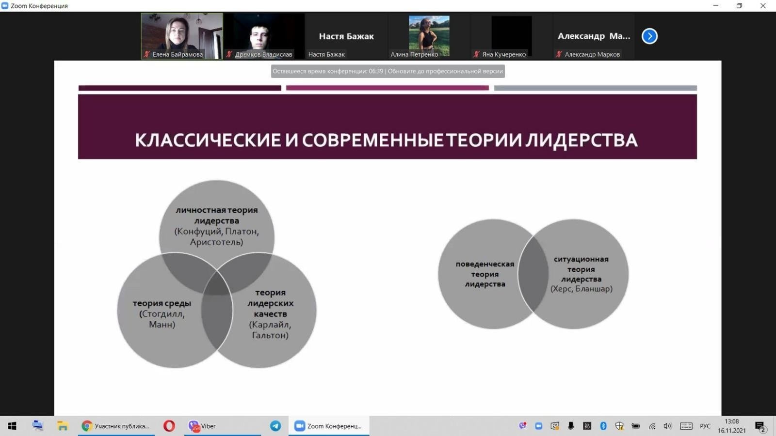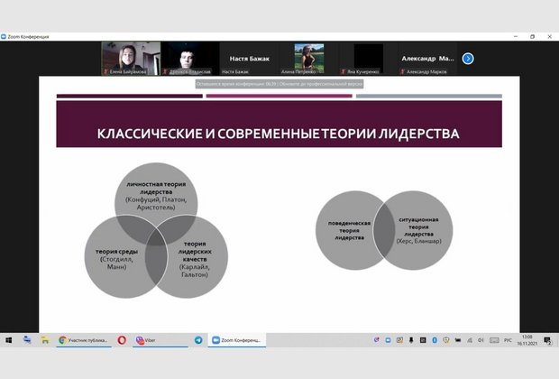 18 листопада 2021 року з дисципліни «Філософія» (викладач – доцент кафедри суспільно-наукових дисциплін, к.філос.н. Байрамова О.В.) відбувся веб-семінар у форматі диспуту на тему «Філософія лідерства», під час якого учасники продемонстрували обізнаність з актуальних проблем і тем сучасного лідерства.