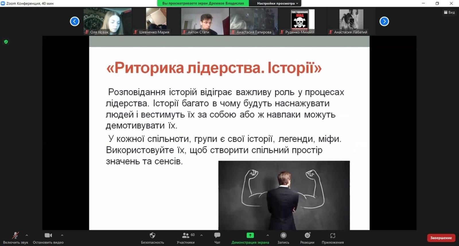 Діалогічна структура заняття сприяла обміну теоретичними знаннями через розгляд різних підходів (концепцій) – класичних та сучасних теорій лідерства, соціально-філософських концепцій теорії лідерства, психоаналітичного підхіду до проблеми лідерства тощо. Здобувачка освіти Яна Кучеренко (спеціальність «Право») підготувала тестування для всіх учасників та надала практичні поради щодо розвитку активності обох півкуль головного мозку. Анастасія Юкіна (здобувачка вищої освіти за спеціальністю «Менеджмент») сформувала власний перелік найкращих фільмів та книг з розвитку лідерських якостей.