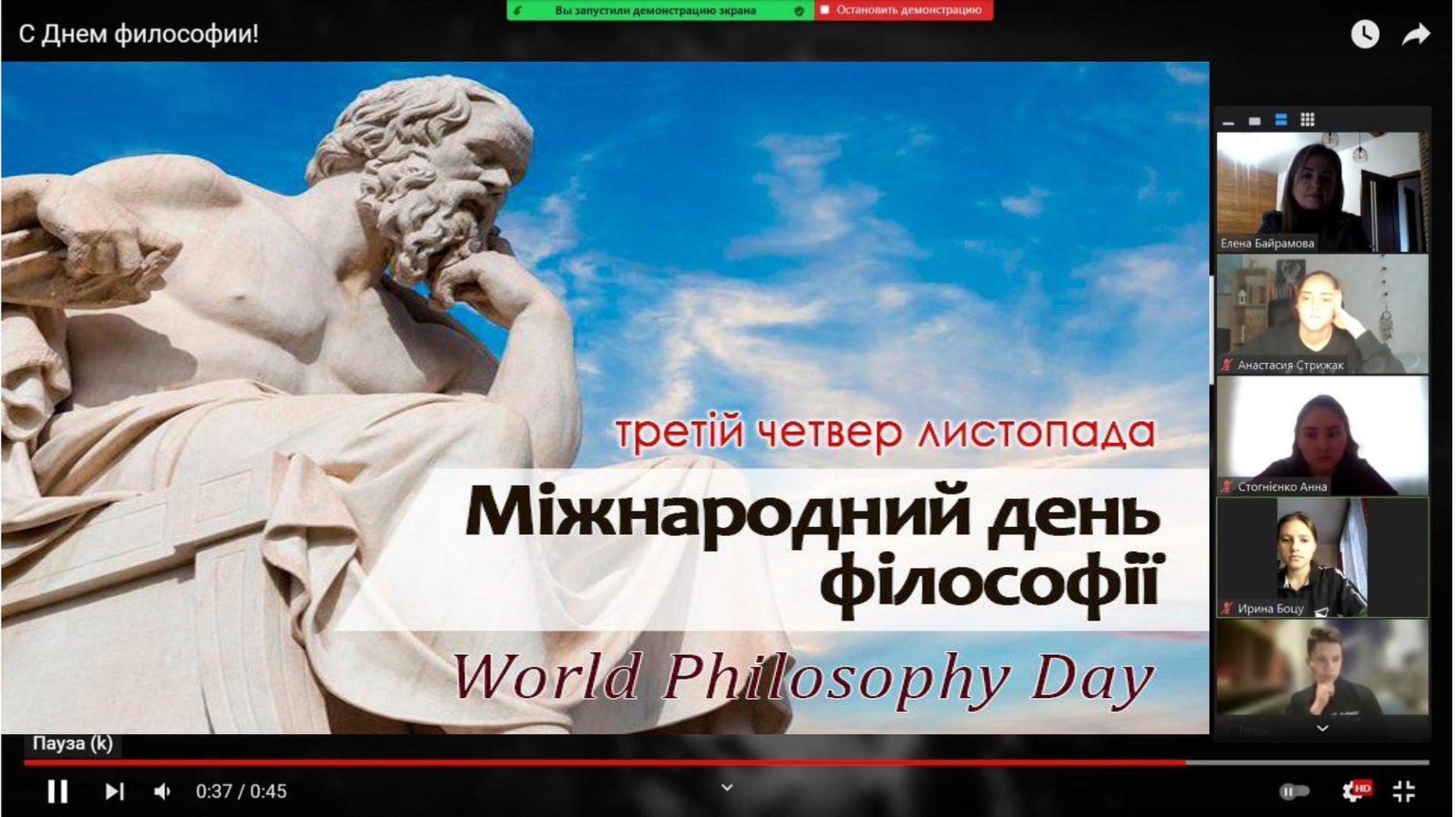 Щороку в третій четвер листопада в Україні відзначають Міжнародний день філософії, запроваджений ЮНЕСКО у 2002 році. Наразі цей день святкують у понад 80-ти країнах світу. В 2020 році Міжнародний день філософії припадає на 19 листопада. Головна мета святкування Міжнародного Дня філософа полягає в тому, щоб знайти спільну платформу обговорення глобальних соціокультурних перетворень, які відбуваються зараз, долучити людей до багатолітньої філософської спадщини, відкрити сферу повсякденного мислення для нових ідей і стимулювати публічні дебати мислителів і громадянського суспільства з приводу викликів, що постають перед соціумом сьогодні, сприяти створенню суспільства.