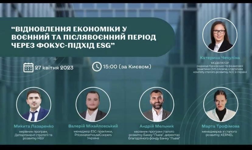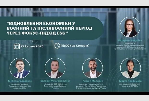 27 квітня 2023 року викладачі кафедри Менеджменту ННІУЕБ взяли участь у вебінарі «Відновлення економіки у воєнний та післявоєнний період через фокус-підхід ESG».
