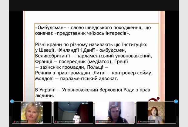 На зустрічі були висвітлені питання з історії створення інституту омбудсмана, важливістю здійснення парламентського контролю за додержанням конституційних прав і свобод людини, права й обов'язки Уповноваженого з прав людини та можливості звернень громадян до представництв у Києві та Одесі. До зустрічі долучилися 97 студентів, які могли ознайомитися з діяльністю представництва Уповноваженого Верховної Ради України з прав людини в Одеській області. Доповідач змогла в доступній та живій формі донести до слухачів основні напрямки роботи представництва. Студенти активно підтримували бесіду, відповідаючи на запитання. Наприкінці зустрічи студенти були запрошені для проходження практики в офіс регіонального координатора взаємодії з громадкістю в місті Одеса.